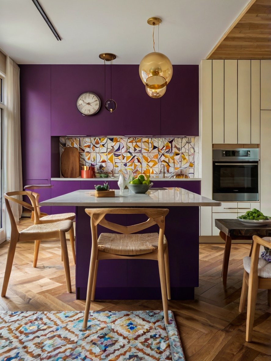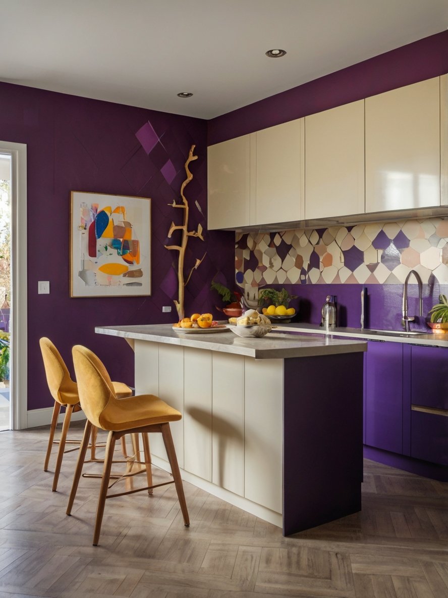 The deep purple walls and cabinetry give this kitchen an opulent and dramatic feel. Purple is often associated with creativity and luxury, making it a perfect choice for a dopamine-inspired kitchen. The bold hue is balanced by soft cream cabinetry and a light-toned kitchen island, preventing the space from feeling too dark or overwhelming. The contrast between the deep purple and neutral tones creates a sophisticated and inviting atmosphere, proving that dopamine decor doesn’t always have to be bright—sometimes, rich and moody hues can be just as impactful.