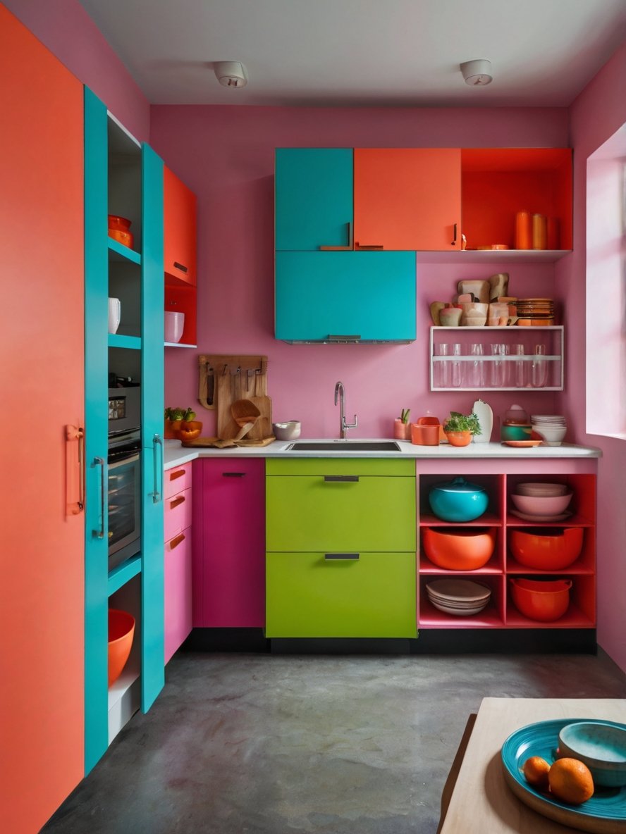 The first thing that stands out in this kitchen is the fearless use of color blocking. Instead of blending hues in a subtle gradient, the design features distinct, geometric sections of bright turquoise, coral orange, neon green, and pink. This sharp contrast creates a high-impact visual that instantly stimulates the senses and enhances the dopamine effect.