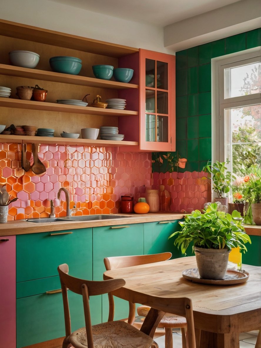 One of the standout design elements in this kitchen is the hexagonal tile backsplash, featuring a gradient of pink and orange hues. The honeycomb-like structure of the tiles adds an extra layer of dimension, creating a stunning interplay of light and shadow.