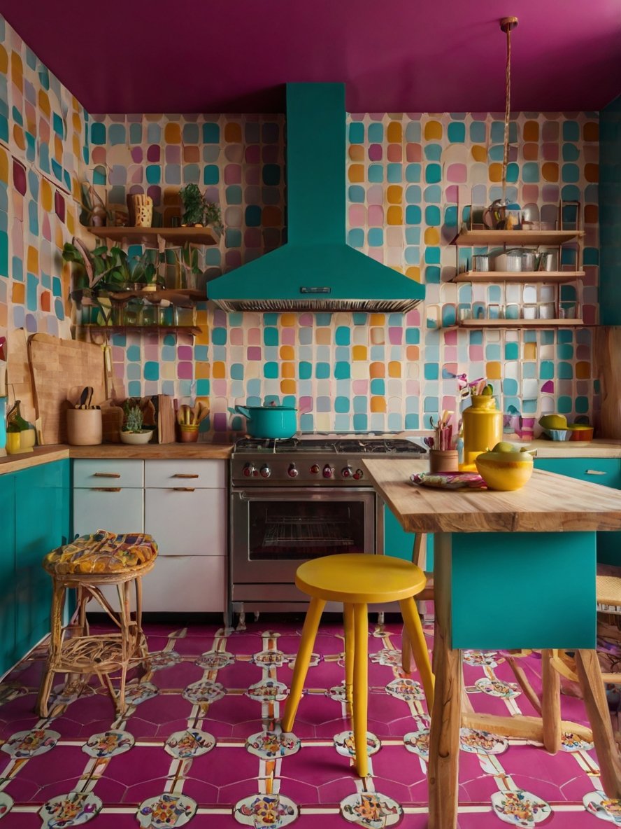 Instead of a repetitive pattern, the backsplash tiles are arranged in an irregular color sequence, reinforcing the eclectic and artistic nature of the space. This type of design encourages creativity and spontaneity, making the kitchen feel less like a structured workspace and more like an artistic sanctuary.
