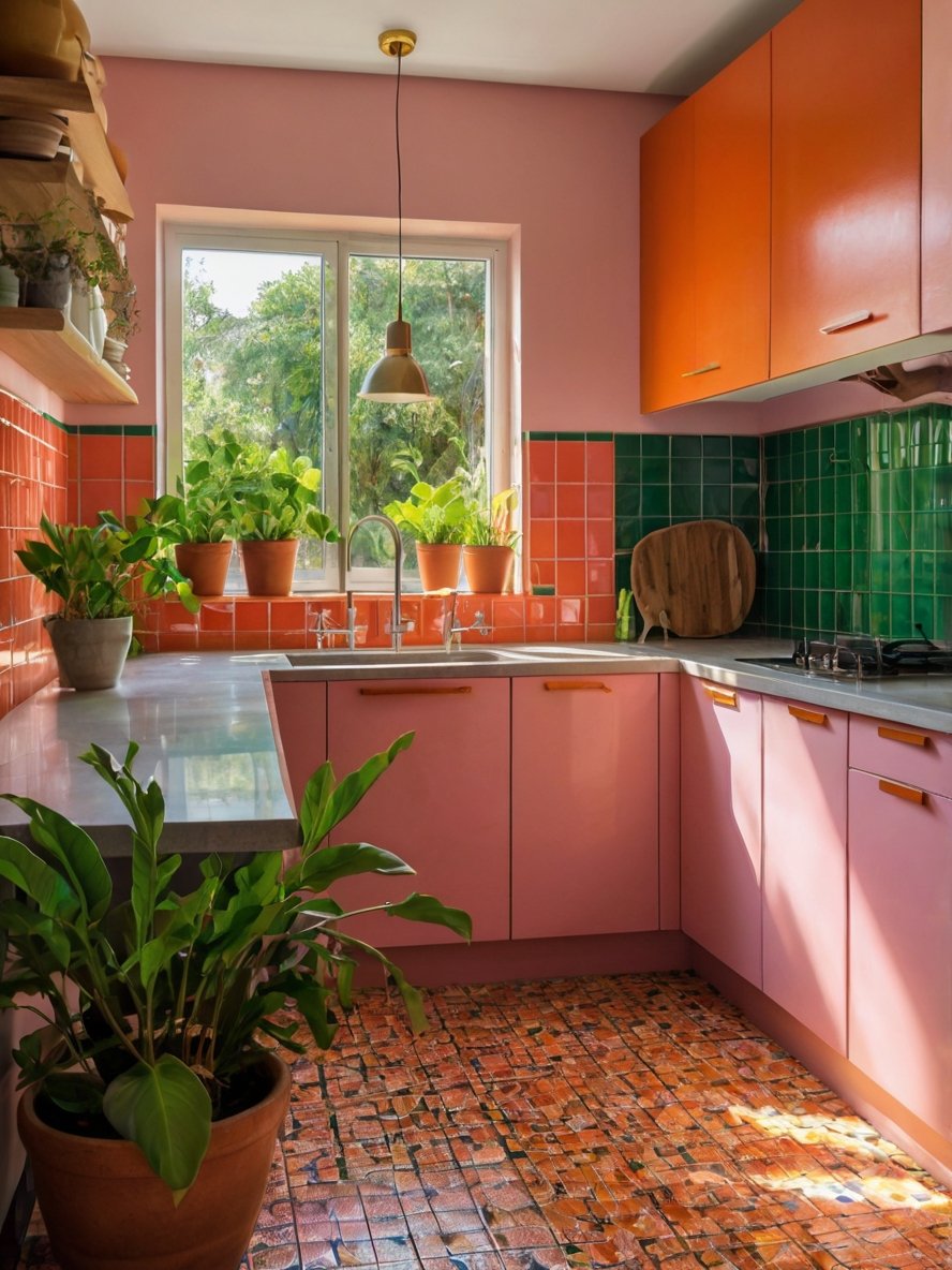 Ultimately, this kitchen succeeds in creating a space that is both high-energy and deeply calming. The bold interplay of pink, orange, and green stimulates creativity and joy, while the soft natural materials and biophilic elements ensure that the space remains soothing and welcoming.