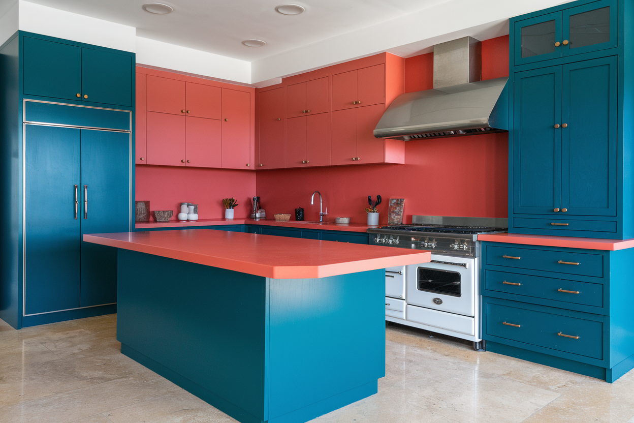 Color blocking in a kitchen is not just about aesthetics; it also helps create a sense of organization and hierarchy within the space. Each cabinet section feels like its own designated zone, making it easier to navigate the layout. The balance between warm and cool tones—orange and pink against blue and green—ensures that the space feels both vibrant and harmonious.