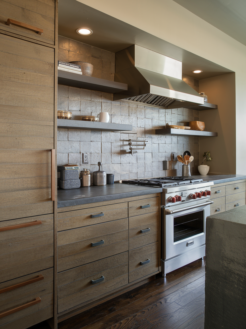 Adding subtle textures to cabinets, countertops, or backsplash creates visual interest without clutter. Think wood grain finishes, embossed tiles, or matte stone surfaces. I love this approach because it keeps the space contemporary while avoiding a flat, sterile look. Textured surfaces make the kitchen feel rich, layered, and thoughtfully designed. Plus, they are often more forgiving with smudges or minor wear and tear.
