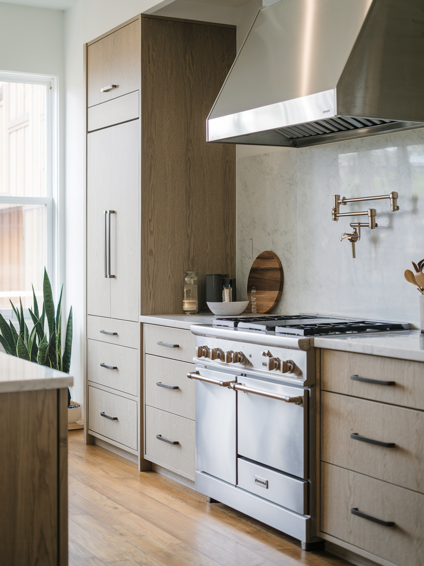 Tall cabinets and vertical shelving maximize storage in compact contemporary kitchens. Using height efficiently keeps counters clear and everything accessible. I personally think vertical storage is underrated in design conversations, yet it makes such a huge difference. It allows for clever organization, keeps the space looking streamlined, and ensures you can fit all your essentials without overcrowding your kitchen.