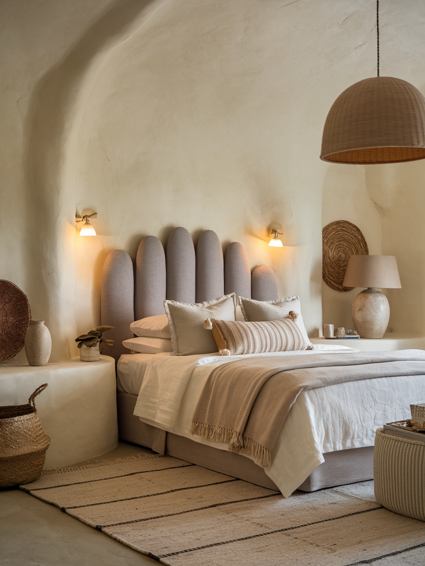 A padded or upholstered headboard instantly adds comfort and style to a bedroom. It provides support for sitting up and reading or relaxing in bed. Soft fabrics like linen or velvet enhance the tactile experience and add warmth to the space. Headboards also create a focal point and anchor the room visually. Choosing a headboard that complements the bedding and color scheme contributes to the overall cozy and inviting atmosphere, transforming your bedroom into a sanctuary for restful nights and leisurely mornings.