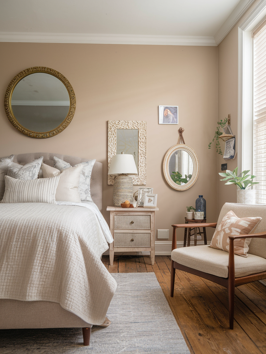 Adding mirrors enhances both light and space in a cozy bedroom. A well-placed mirror reflects natural light, brightening the room and creating an airy feel. Decorative frames add personality and style while complementing the room’s color palette. Mirrors also create a sense of depth, making smaller bedrooms feel larger and more inviting. Thoughtful use of mirrors contributes to a balanced, layered, and comfortable atmosphere. This simple addition elevates both the aesthetic and functionality of your bedroom sanctuary.