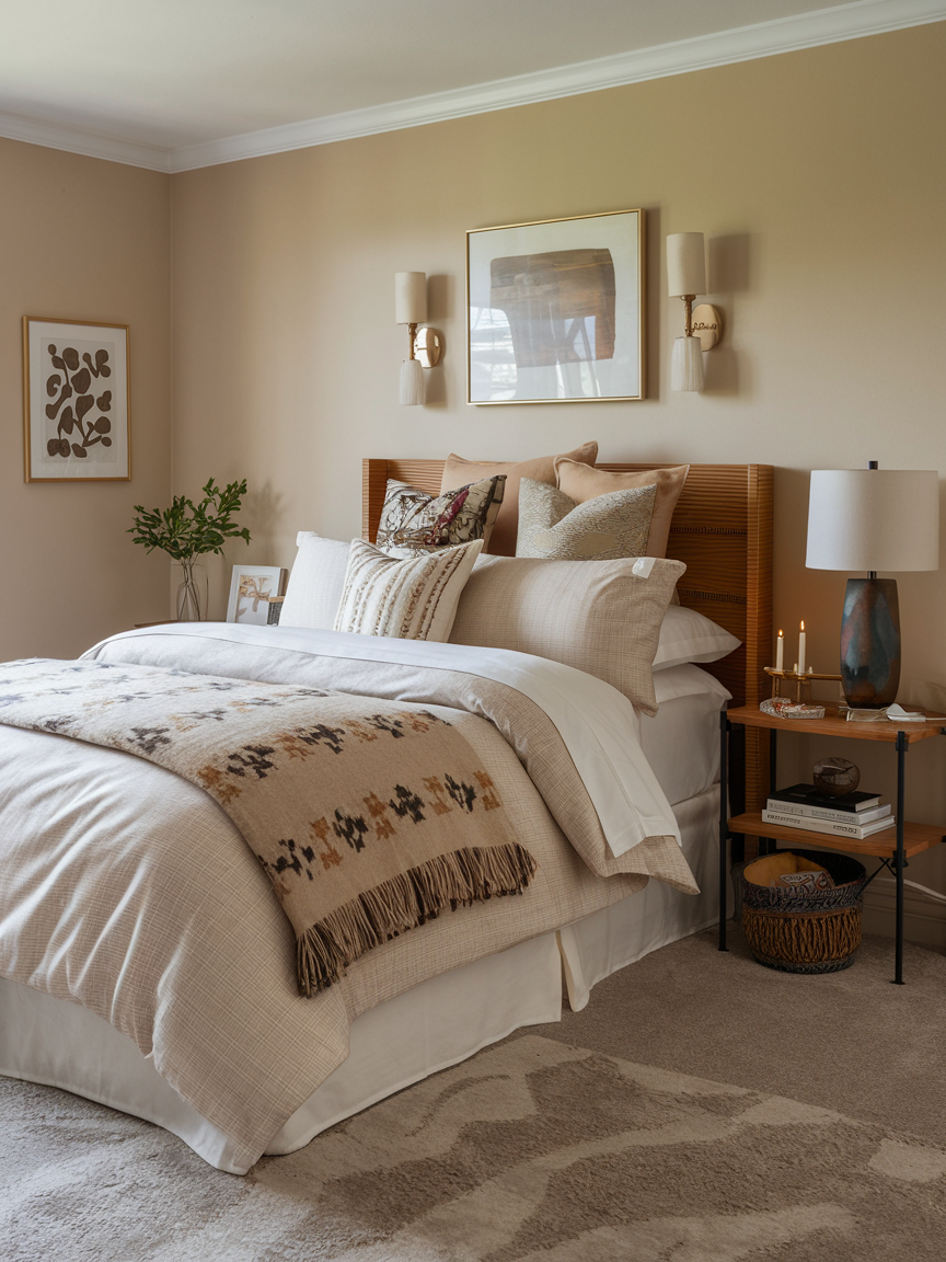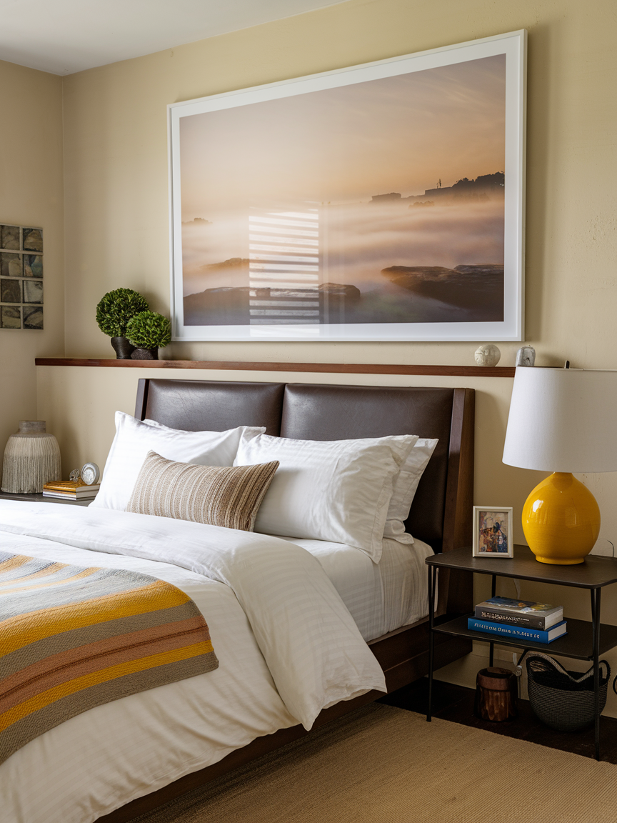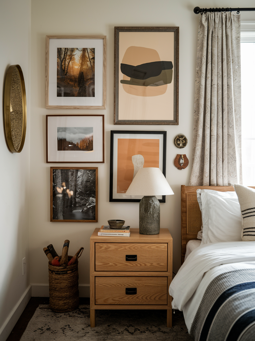 Adding art in a layered arrangement personalizes your bedroom and adds visual interest. Mix framed photos, paintings, or prints to create a curated gallery wall. Art reflects your personality, evokes emotion, and contributes to a cozy, inviting vibe. Layered wall art makes the room feel dynamic without overwhelming the space. Thoughtful placement enhances the overall atmosphere and ties together other elements like bedding, rugs, and furniture. A well-designed gallery wall strengthens the sense of comfort, warmth, and sanctuary in your bedroom.