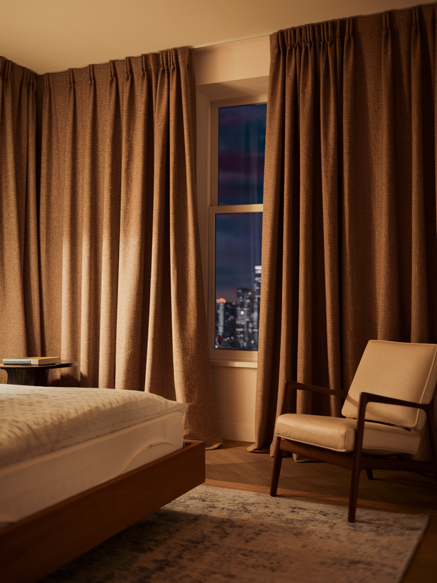 Heavy, textured curtains instantly make a bedroom feel cozier. They provide privacy, soften sunlight, and add a tactile element to the room. Materials like linen, velvet, or woven fabrics enhance warmth and visual interest. Layering sheer curtains underneath allows you to control light without losing softness. Warm, flowing drapes frame windows beautifully, contributing to a relaxed, intimate atmosphere. Well-chosen curtains complete the room’s design and ensure that your bedroom feels snug, private, and inviting.