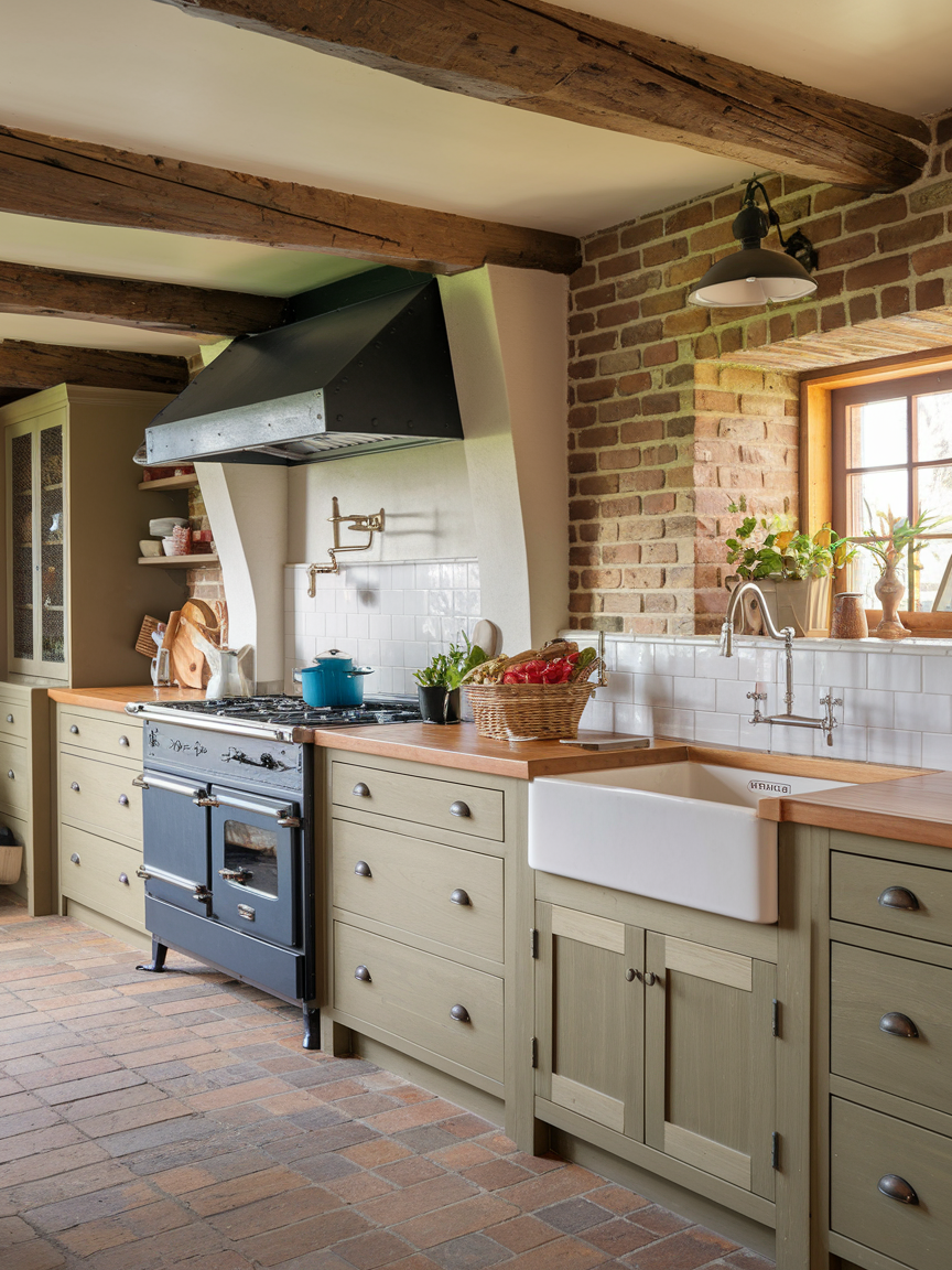 A classic farmhouse sink is one of the ultimate touches for a cottage kitchen because it combines charm with pure practicality. Its deep, apron-front design makes washing oversized pots, pans, and even big vegetables much easier than your average sink. I personally love how it immediately sets the tone for a cozy, country-inspired space. Pair it with a vintage-style faucet, some wooden cutting boards, and a few potted herbs on the windowsill, and your kitchen suddenly feels both functional and welcoming. FYI, farmhouse sinks also make cleanup less awkward because the deep basin helps contain splashes, which is a huge win in any busy kitchen.