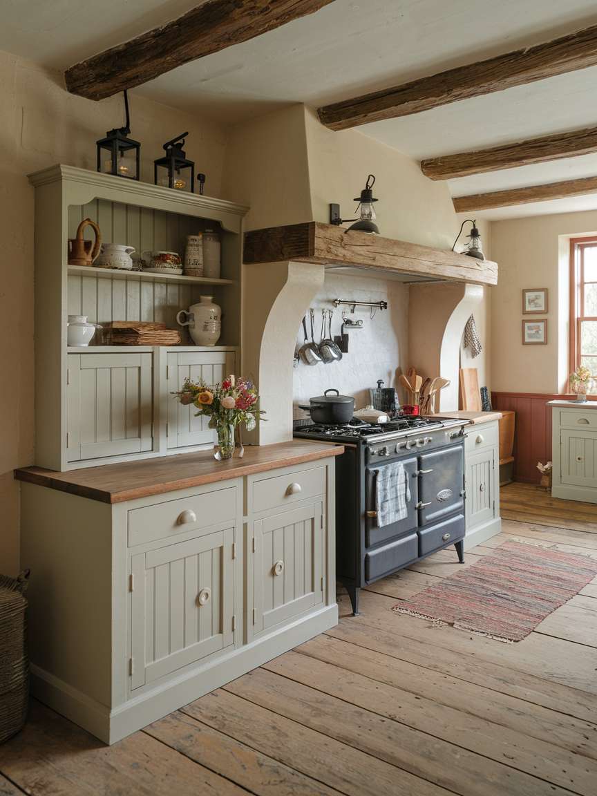 Exposed wooden beams add architectural interest and charm to a cottage kitchen. I personally love how they create a sense of height and warmth, making the space feel both cozy and spacious. Even if your home doesn’t have original beams, faux beams can achieve the same rustic look without structural changes. They add texture and character, reinforcing the cottage aesthetic. Pairing open beams with light-colored walls, wooden counters, or vintage lighting amplifies the charm. I think they are perfect for creating a kitchen that feels like it has history and personality, turning everyday cooking into a visually delightful experience.