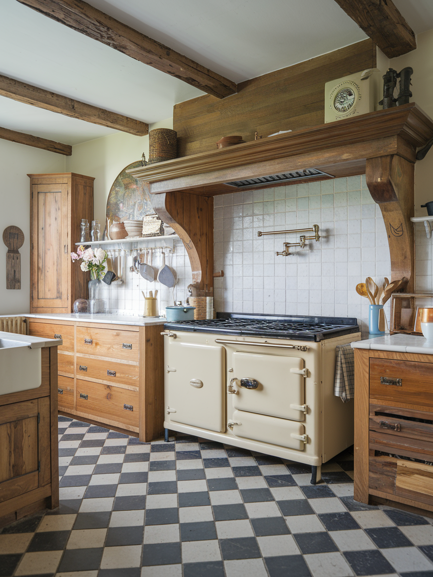 Classic checkerboard or patterned flooring is a bold, timeless choice for cottage kitchens. I love how black-and-white tiles or subtly patterned floors instantly give the room personality while still complementing rustic cabinetry and wooden accents. Floors like these are also practical because they help hide scuffs, crumbs, or spills, which is always a bonus in busy kitchens. From a design perspective, patterned flooring anchors the space visually, making other elements like pastel cabinets, vintage appliances, or open shelving pop. It’s a playful yet classic touch that enhances the charm of a cottage-style kitchen.