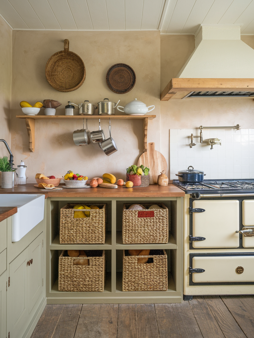 Woven baskets are versatile storage solutions that add texture and charm to cottage kitchens. I enjoy using them for bread, fruits, vegetables, or miscellaneous kitchen items. They are practical, lightweight, and easy to move, while also adding a rustic, tactile element to the space. Baskets help keep countertops tidy without sacrificing style. Personally, I like mixing different sizes and shapes for visual interest and maximum storage. In a cottage kitchen, woven baskets are the perfect blend of form and function, helping to create a warm, organized, and visually appealing environment.