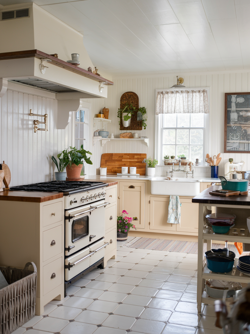 Beadboard paneling adds subtle texture and character to cottage kitchen walls or cabinet fronts. I love how it evokes classic country style without feeling overdone. Painted in soft hues like white, cream, or muted pastels, beadboard creates a cozy, inviting atmosphere. It is also practical, as it hides minor scuffs and marks while reinforcing the rustic aesthetic. Layer it with wooden shelves, open storage, or vintage hardware, and your kitchen immediately feels curated and timeless. IMO, beadboard is a small detail that makes a huge impact on the overall charm and warmth of the space.
