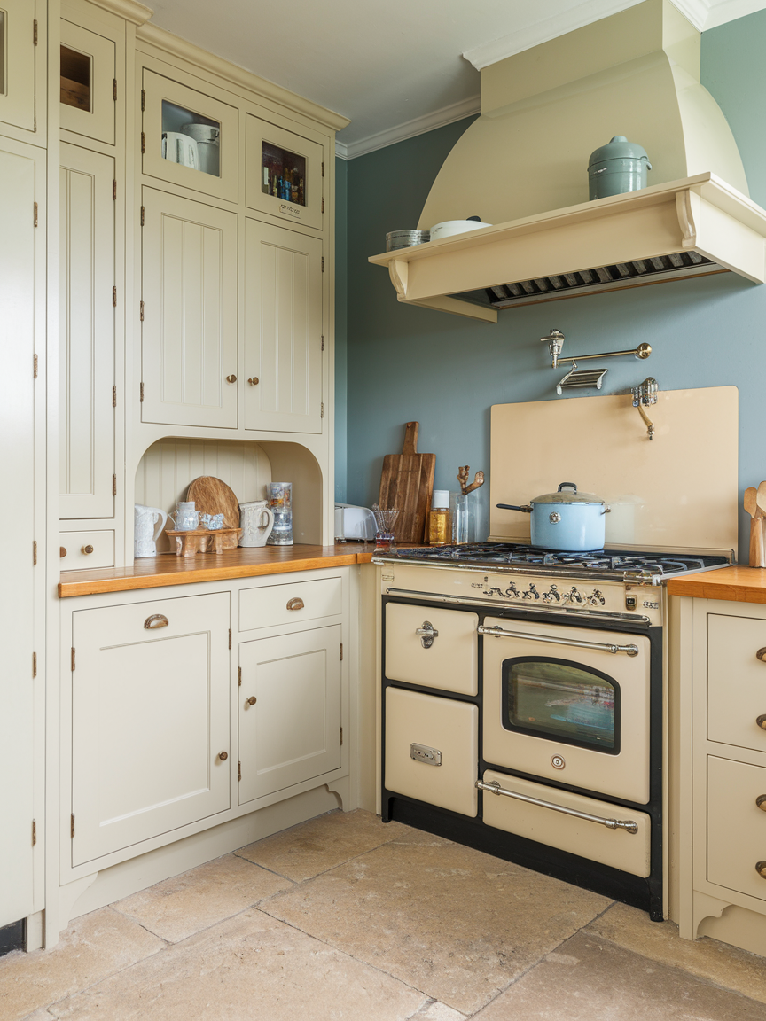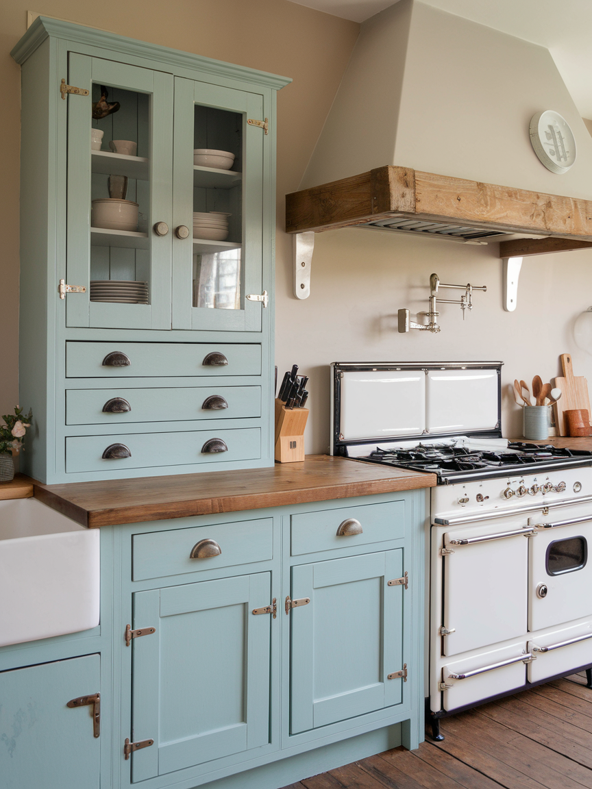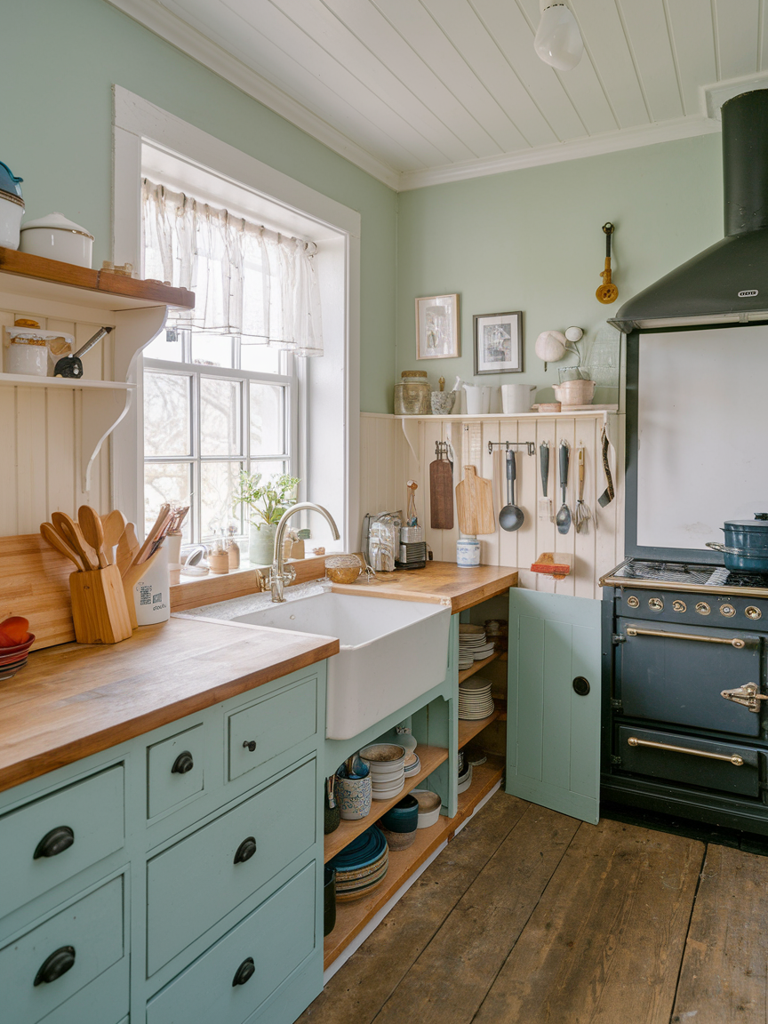 Wooden countertops bring warmth, texture, and rustic charm into a cottage kitchen like nothing else. They are ideal for chopping, baking, or simply adding visual interest to your space. I love pairing natural wood with painted cabinets or soft-colored walls because it creates a balanced, inviting look. A well-maintained wooden countertop can last for years, especially if properly sealed to resist moisture and stains. I personally think nothing beats the feel of warm wood under your hands while cooking, it’s comforting and connects you to a more traditional, hands-on way of preparing meals. Wooden counters are both practical and incredibly cozy.