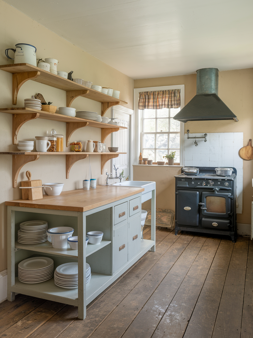 Open rustic cabinets combine functionality and charm perfectly. I love how they allow you to display dishes, cookbooks, and decorative items while keeping everything accessible. They create a sense of openness and personality, making your kitchen feel like a warm, curated space rather than a purely functional one. In cottage kitchens, open cabinets encourage organization and creative styling. Wooden finishes, painted surfaces, or distressed textures can enhance the rustic appeal. I personally think open rustic cabinets are an effortless way to combine practicality with cozy, country-style aesthetics.