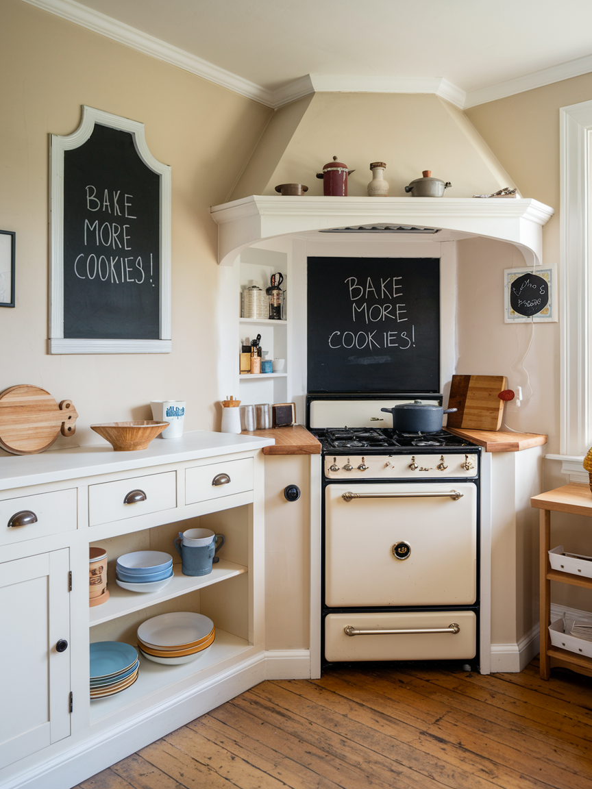 Chalkboard accents are a fun and functional addition to cottage kitchens. I love using them for grocery lists, family notes, or even doodles. They add a playful, personal touch while keeping important information visible and accessible. In addition to being practical, chalkboards contribute to a cozy, lived-in feel that defines cottage kitchens. You can paint a small section of a cabinet door, pantry, or wall for this effect. IMO, chalkboard accents encourage interaction and creativity, helping your kitchen feel lively, personalized, and welcoming at the same time.