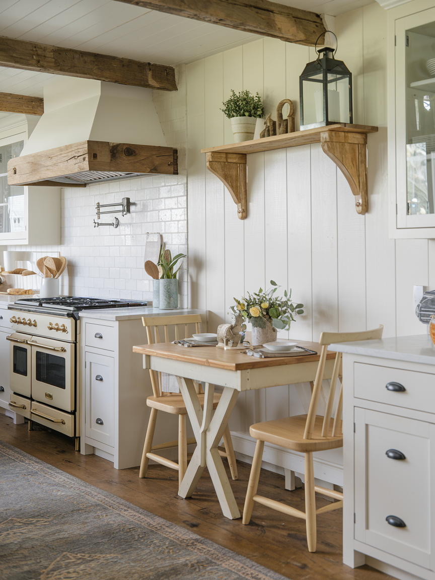Incorporating a small dining nook with a farmhouse-style table and chairs transforms a cottage kitchen into a true gathering space. I personally adore these cozy corners because they double as spots for casual meals, coffee breaks, or even homework sessions. Even compact kitchens can accommodate a built-in bench or a small table with chairs to create warmth and intimacy. A farmhouse nook encourages family and friends to linger while you cook, turning your kitchen into the social hub of the home. Adding cushioned seating, a rustic table runner, or a centerpiece of fresh flowers makes the nook feel inviting and charming, perfect for daily use and occasional entertaining.
