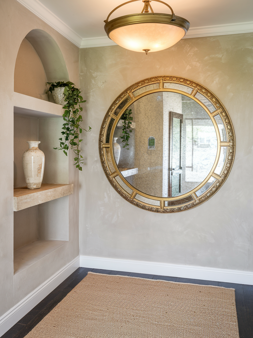 A statement mirror is one of the easiest ways to make an entry hallway feel brighter, larger, and more welcoming. Mirrors reflect natural and artificial light, helping narrow or dark hallways feel more open and airy. Choosing a bold frame, such as gold, wood, or black metal, can turn the mirror into a decorative focal point instead of just a functional item. Whether you prefer a round mirror, an oversized rectangular design, or a vintage-style frame, this simple addition makes the entry feel more polished and thoughtfully designed while also being practical for quick checks before leaving the house.