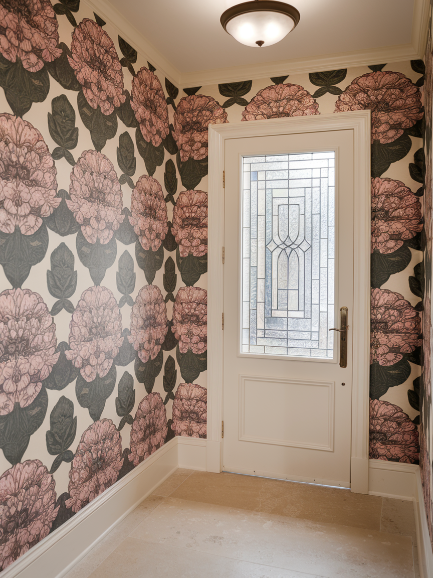 Wallpaper is a great way to give the hallway personality without adding extra furniture. Patterns like florals, stripes, or geometric prints can make the entry feel lively and interesting. Even using wallpaper on just one wall can create a strong visual effect. Modern peel-and-stick wallpaper makes it easy to change the look whenever you want. This simple update can turn a plain hallway into a memorable space.