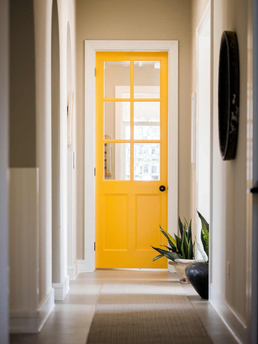 Painting the inside of the front door is an easy way to add color and character to the entry hallway. A bold shade like navy, green, or black creates contrast and makes the space feel more stylish. The door becomes part of the design instead of blending into the wall. This small change can make the entry feel more unique and welcoming without requiring a big renovation.