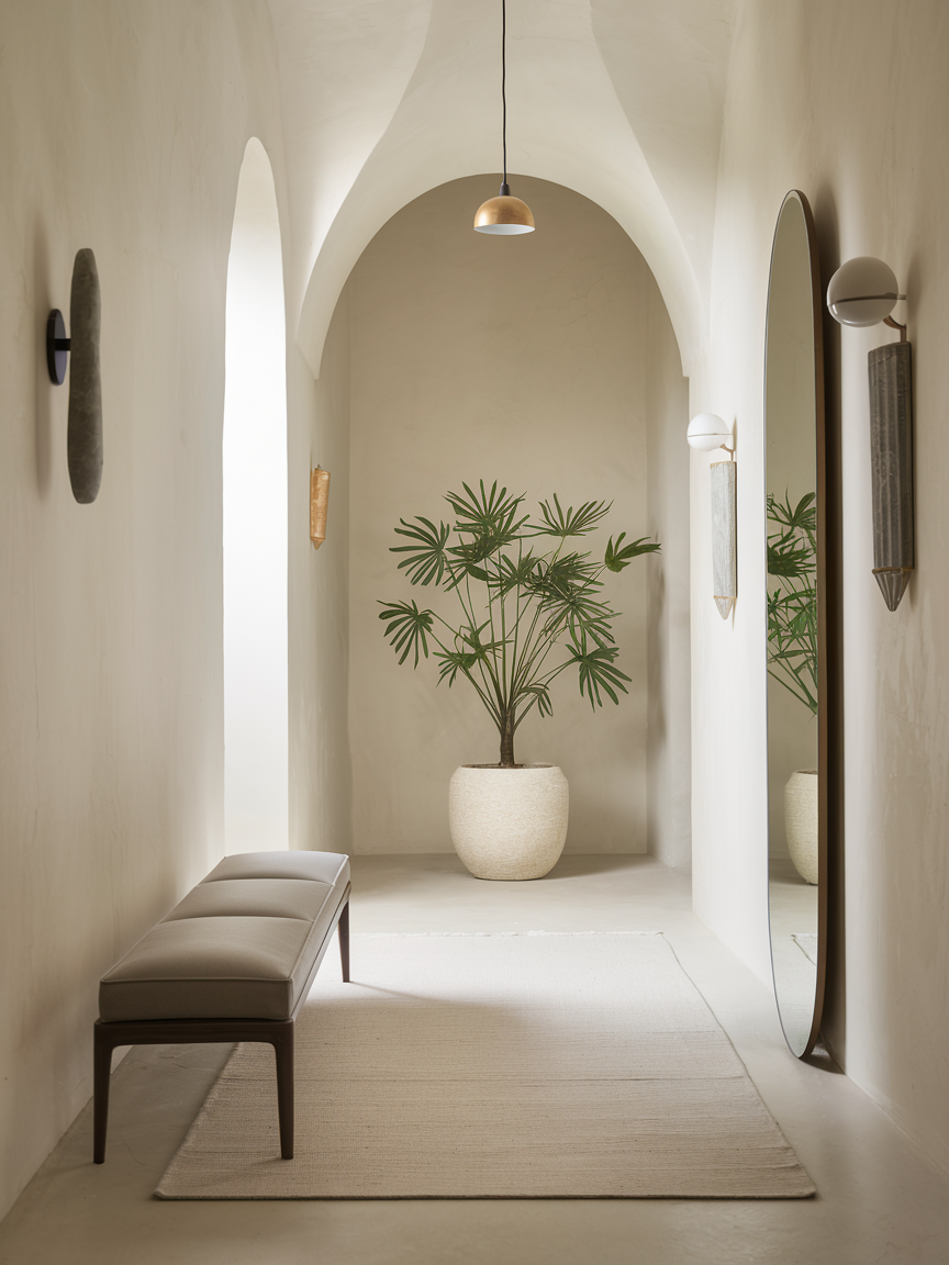 A minimalist entry hallway focuses on simplicity and clean lines. Using only a few pieces of furniture and keeping colors neutral creates a calm and modern look. This style works especially well in small spaces because it keeps the area from feeling crowded. A simple mirror, a slim bench, and soft lighting can be enough to make the hallway look elegant and organized.