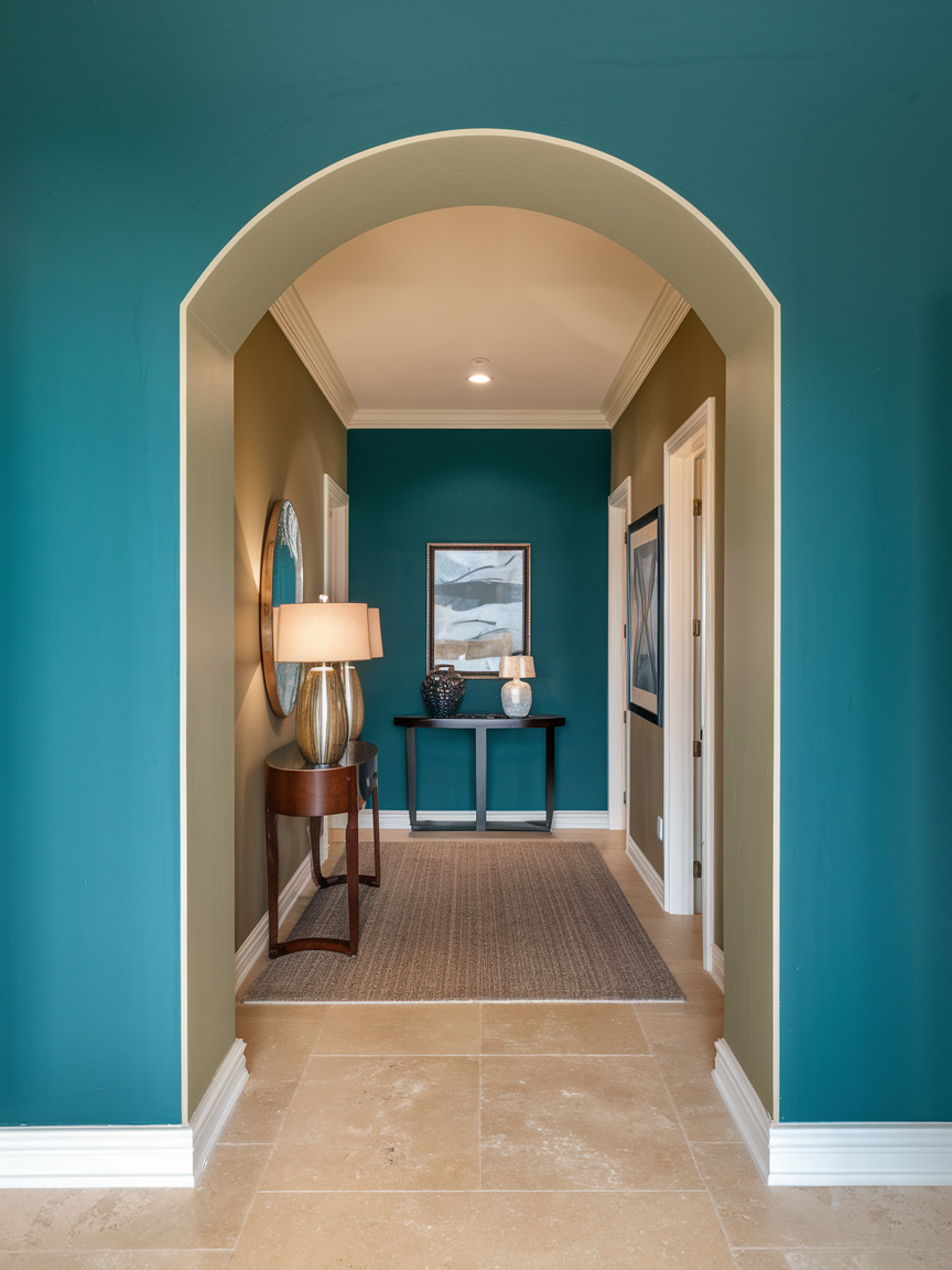 An accent wall is a simple but powerful way to give your entry hallway a strong personality without overwhelming the entire space. By using paint, wallpaper, wood panels, or textured finishes on one side, you can create a focal point that immediately draws attention when someone walks in. Dark colors can make the space feel dramatic and sophisticated, while soft tones keep the hallway calm and welcoming. Accent walls also help define the entry area, making it feel like an intentional part of the home instead of just a passageway between rooms. When paired with good lighting and minimal decor, an accent wall can completely transform the atmosphere of the hallway.