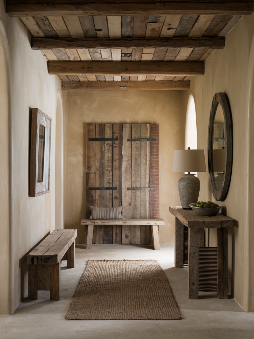Adding rustic wood elements to an entry hallway creates warmth, texture, and a natural feeling that makes the space more inviting. Wooden benches, console tables, wall panels, or ceiling beams can instantly make the hallway feel cozy and comfortable. Natural grain patterns and slightly aged finishes bring character that makes the space feel lived-in and welcoming. Rustic wood works beautifully with neutral colors, soft lighting, and woven textures, helping the hallway feel balanced and relaxed. Even small wooden accents, such as frames or shelves, can make a big difference in creating a charming and comfortable entryway.