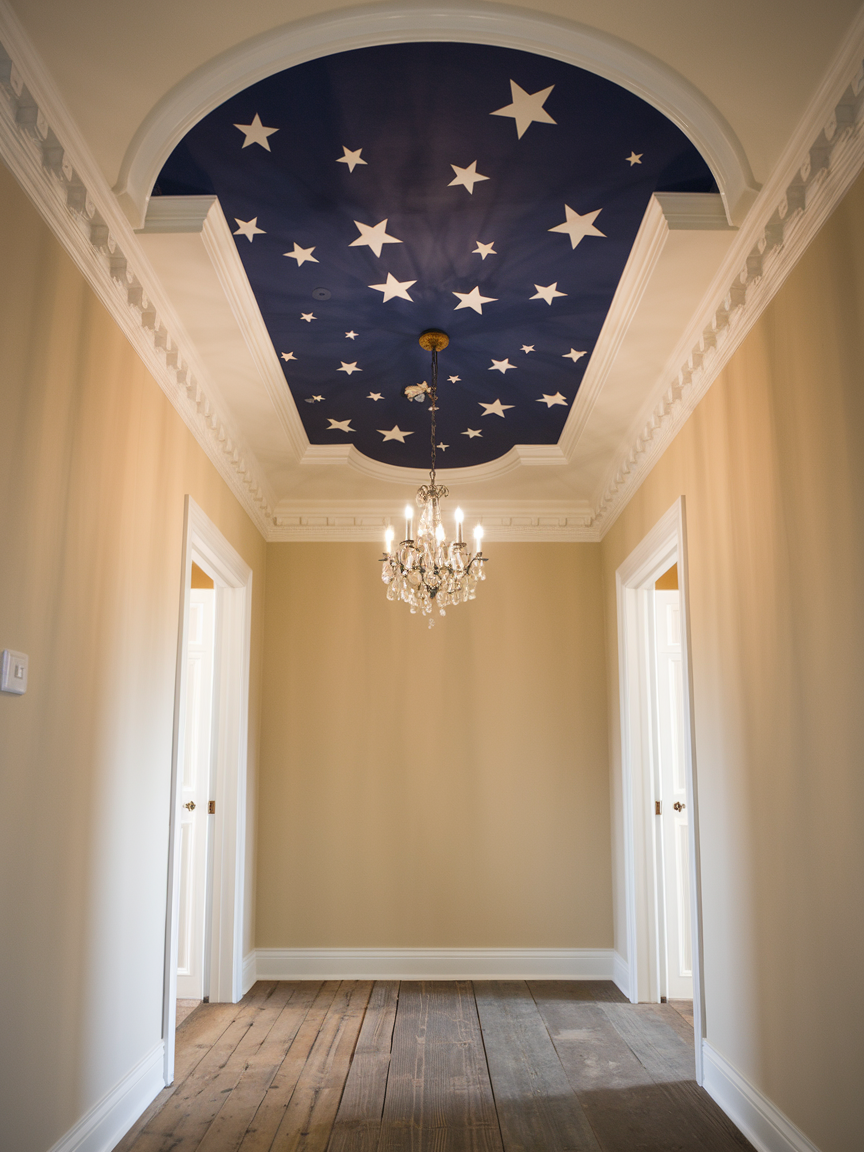 The ceiling is often forgotten in hallway design, but decorating it can make the entry feel unique and memorable. Painting the ceiling in a different color, adding wallpaper, or installing molding creates an unexpected detail that makes the space look more finished. A statement ceiling draws the eye upward, which can make a narrow hallway feel taller and more open. Even subtle changes, such as soft color contrast or simple trim, can add elegance without being too bold. This design idea works especially well when the rest of the hallway is simple, allowing the ceiling to become the highlight of the space.