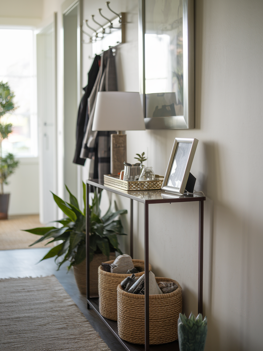 A slim console table is perfect for adding both style and function to an entry hallway without taking up too much space. Its narrow shape fits well in tight areas while still giving you a surface for everyday essentials like keys, mail, or decorative accents. Styling the table with a small lamp, a tray, a vase, or framed photos makes the hallway feel more complete and welcoming. A console table also helps keep clutter organized, making the entryway look clean and intentional instead of messy or crowded.