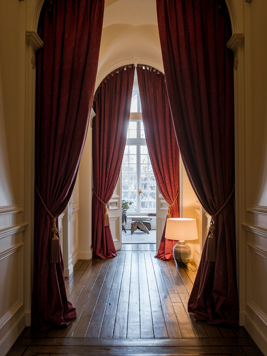 Curtains can add softness, warmth, and elegance to an entry hallway, especially when placed near doors, windows, or open archways. Flowing fabrics help balance hard surfaces like wood, tile, or painted walls, making the space feel more comfortable. Heavy curtains create a rich and dramatic look, while light linen or cotton gives a relaxed and airy feeling. Curtains can also help control light and provide privacy, which makes the entry feel more peaceful. This simple addition makes the hallway feel more complete and thoughtfully decorated.