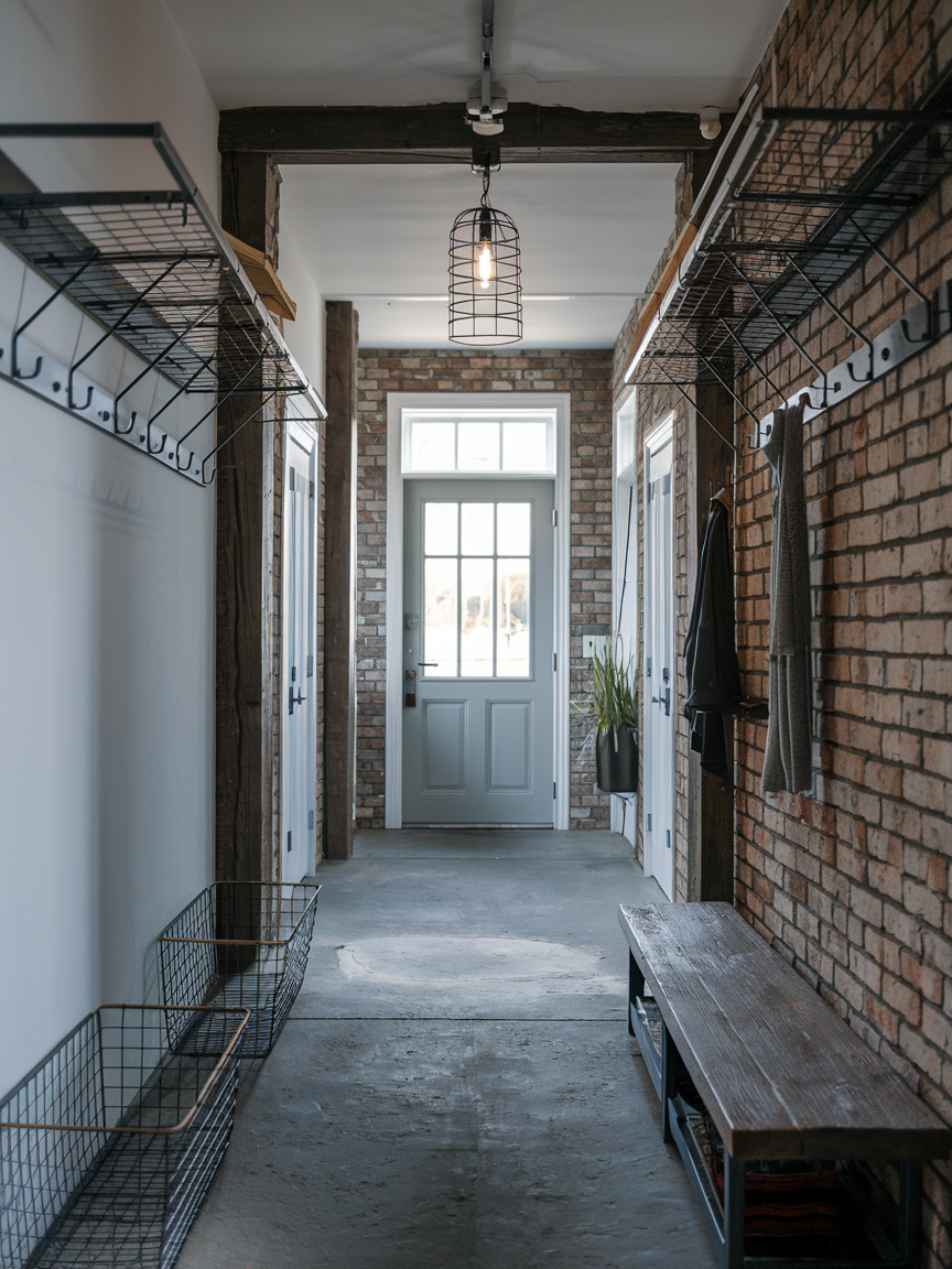 An industrial-style entry hallway creates a bold and modern first impression by using simple shapes and raw materials. Elements like exposed brick, metal hooks, wooden benches, and black light fixtures give the space a strong and stylish character. This design works well for people who like a clean look with a little edge. Mixing metal with warm wood keeps the hallway from feeling cold, while neutral colors help the space stay balanced. Industrial style is perfect for creating an entry that feels modern, functional, and full of personality at the same time.