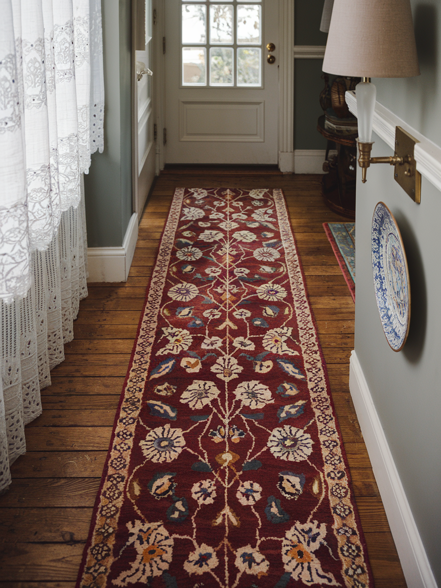 A runner rug instantly adds warmth, texture, and personality to a hallway that might otherwise feel plain or empty. Soft fabric underfoot makes the space more comfortable while also protecting the floor from daily wear. Choosing a patterned runner can bring color and visual interest, while neutral tones create a calm and elegant look. Rugs also help define the walkway and make the entry feel more like a designed space instead of just a passage between rooms.