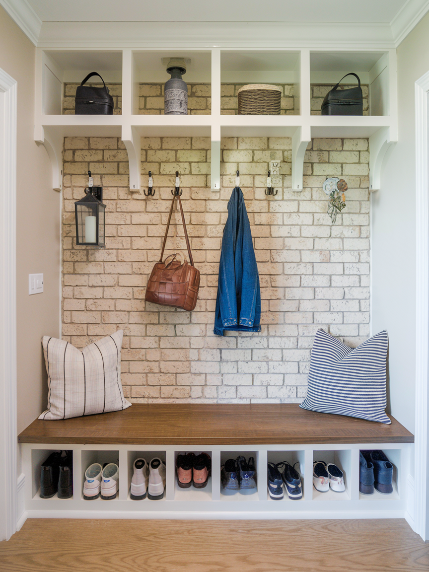 A bench adds both comfort and function to an entry hallway. It gives you a place to sit while putting on shoes or setting down bags when you come home. Adding cushions or pillows makes the bench feel more cozy and decorative. Some benches also have storage underneath, which is perfect for keeping shoes or baskets out of sight. A simple bench can make the hallway feel more welcoming and practical.