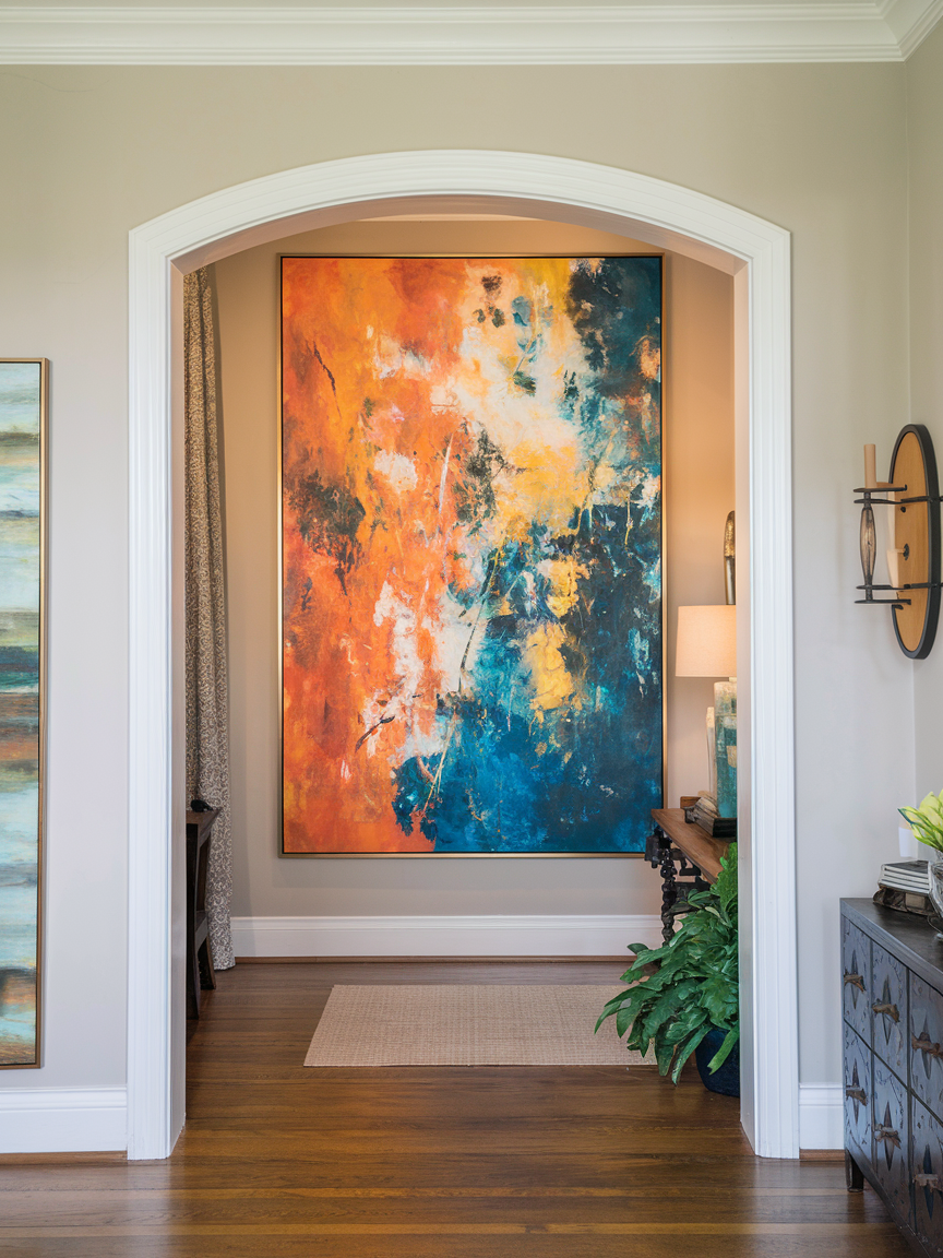 One large piece of artwork can make a stronger impact than many small decorations. An oversized painting, print, or wall hanging creates a focal point that draws attention as soon as someone enters. This works especially well in narrow hallways because it adds style without making the walls feel crowded. Choosing art that matches the colors of your home helps the entry feel connected to the rest of the interior.
