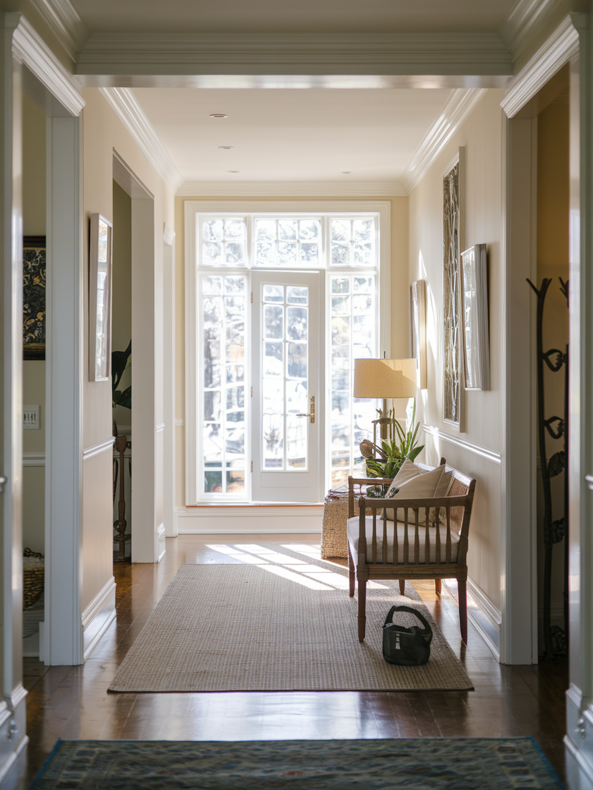 Wall molding adds depth and elegance to a hallway without taking up space. Wainscoting, panel molding, or trim details make the walls look more finished and sophisticated. Painting the molding the same color as the wall keeps the look soft, while contrasting colors make the design stand out. This detail gives the entry a timeless and refined feel.