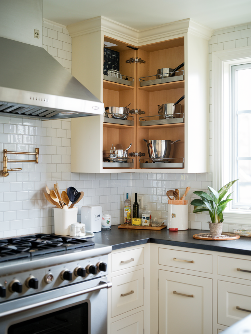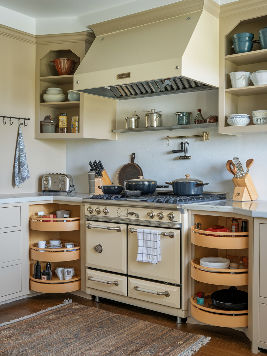 Corner cabinets are notorious for wasted space, but lazy Susans turn awkward corners into highly functional storage zones. These rotating shelves make pots, pans, or pantry items easy to reach, which is a total game-changer. IMO, cooking feels less frustrating when every corner is used efficiently. It’s a simple upgrade that maximizes storage without taking up extra room, and the convenience of a rotating shelf makes every kitchen task smoother and more enjoyable.