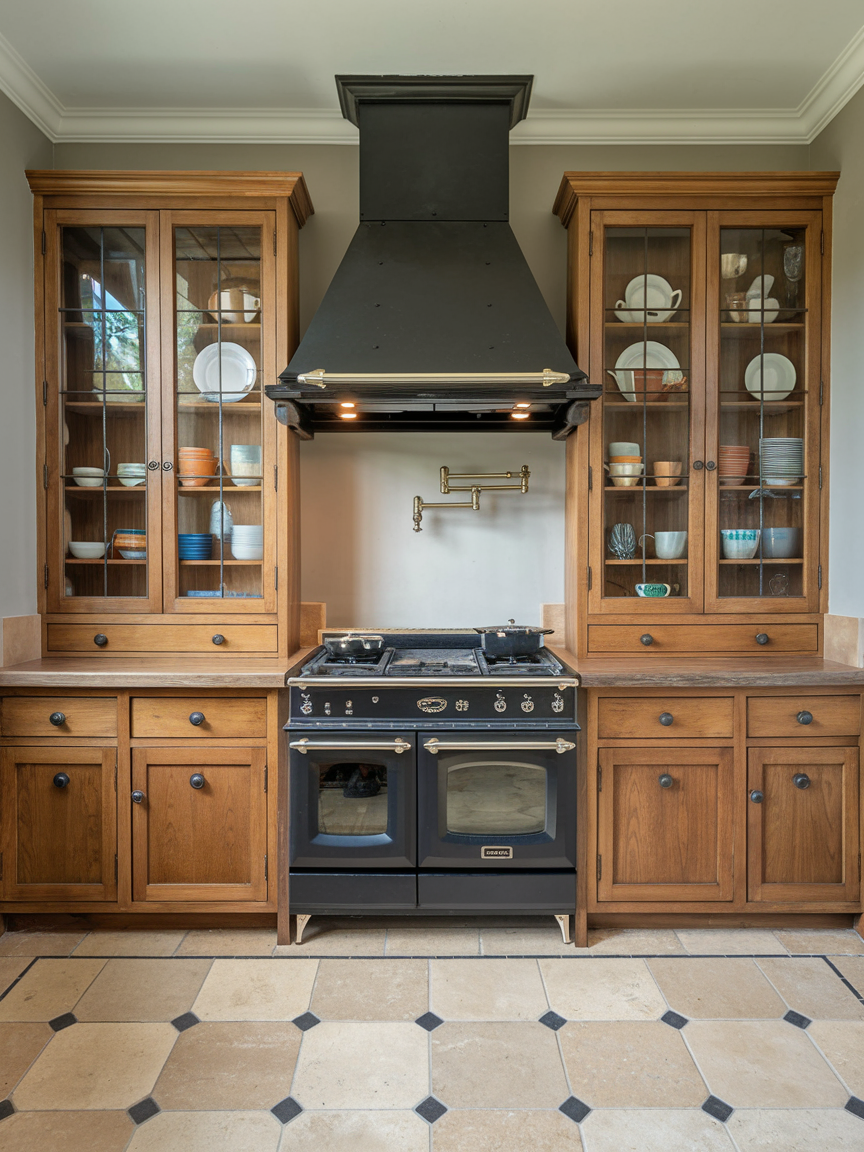 Glass inserts in wooden cabinets balance warmth and openness. They let you show off pretty dishware while keeping a cozy feel. I personally like this mix because it softens the heaviness of wood and adds dimension to the room. Cooking feels lighter and more inspiring in a kitchen with glass inserts, and it encourages organization since the contents are visible. It’s a stylish way to combine practicality with aesthetic appeal, and it suits both modern and traditional kitchens beautifully.