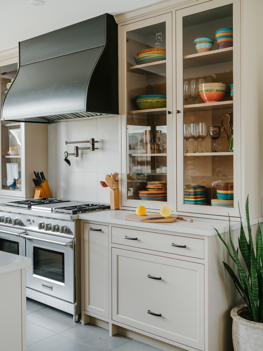 Glass-front cabinets are both stylish and functional. They give your kitchen a lighter, airier feel by breaking up solid cabinetry while showcasing your favorite dishes or glassware. I love how they encourage neat organization because you can see what’s inside at a glance. Plus, displaying colorful plates or stylish mugs can add instant personality to your kitchen. Cooking becomes more enjoyable when your storage doubles as décor, and glass-front cabinets hit that sweet spot between function and aesthetics, making the kitchen feel open and inviting.