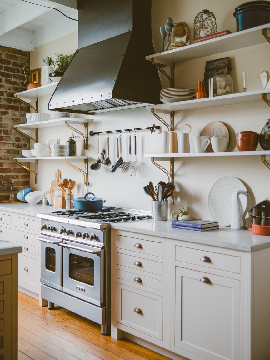 Open shelving adds personality while keeping essentials within easy reach. Use a mix of wood, metal, or painted shelves to suit your style, and arrange plates, mugs, and jars neatly for an organized yet lived-in look. I personally love open shelving for displaying cute bowls or cookbooks—it makes the kitchen feel more dynamic and less like a storage room. Cooking becomes more enjoyable because your kitchen feels open and approachable. Just a heads-up: a little daily tidying goes a long way to keep these shelves looking Pinterest-ready.