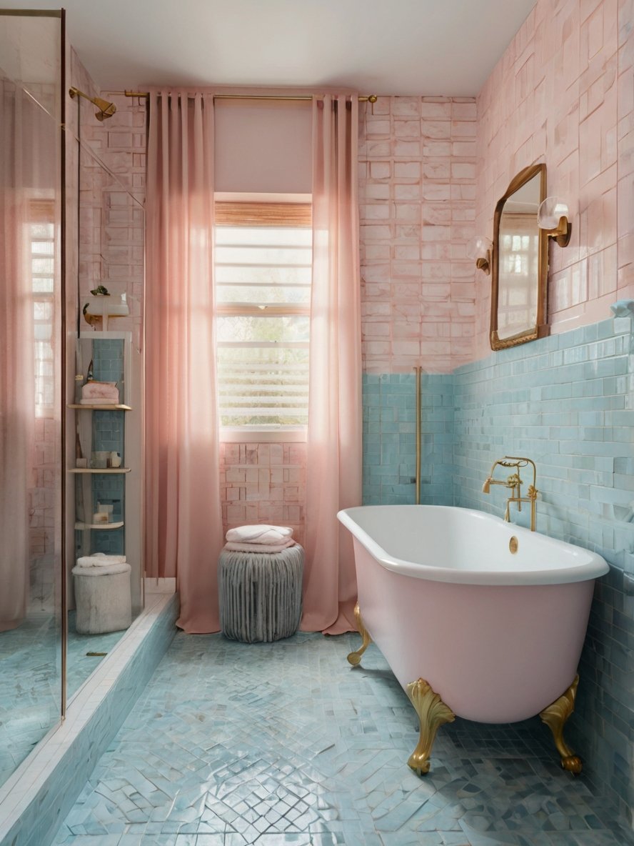 The blush pink sheer curtains soften the overall ambiance and add a romantic touch to the bathroom. Hanging from a gold-toned rod, they frame the window beautifully while allowing natural light to filter through gently. This creates a warm and inviting glow that enhances the pastel tones. The drapery also adds an element of softness, balancing the structured and glossy surfaces of the tiled walls. The combination of sheer fabric and a secondary window shade ensures both privacy and light control, making the space feel comfortable and functional.