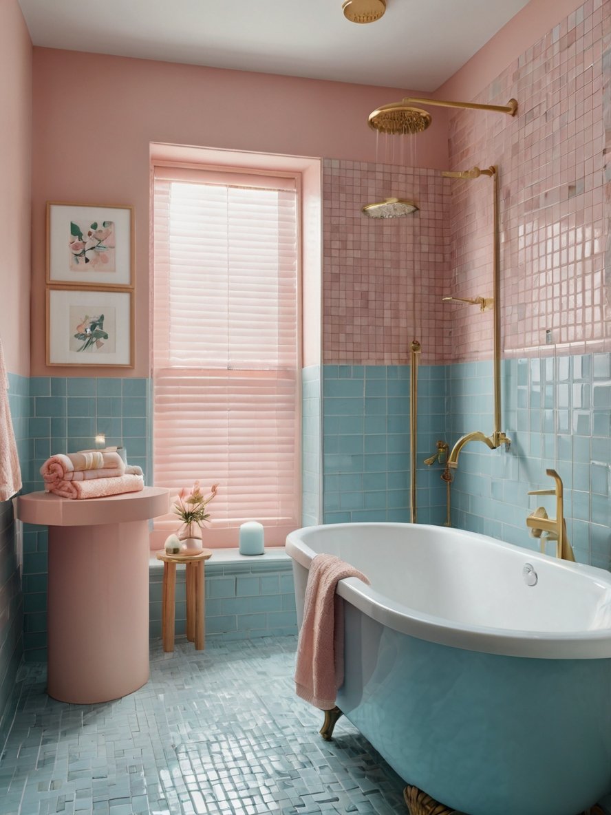 The bathroom features a beautiful tiled wall that combines pastel pink and blue square tiles, creating a visually engaging texture. The transition between the colors is well thought out, with the pink tiles gradually blending into the blue ones, giving a gradient effect. The variation in tile sizes adds depth, ensuring that the design remains dynamic rather than flat. These tiles also enhance the durability and practicality of the space, making it resistant to moisture while contributing to the overall aesthetic.