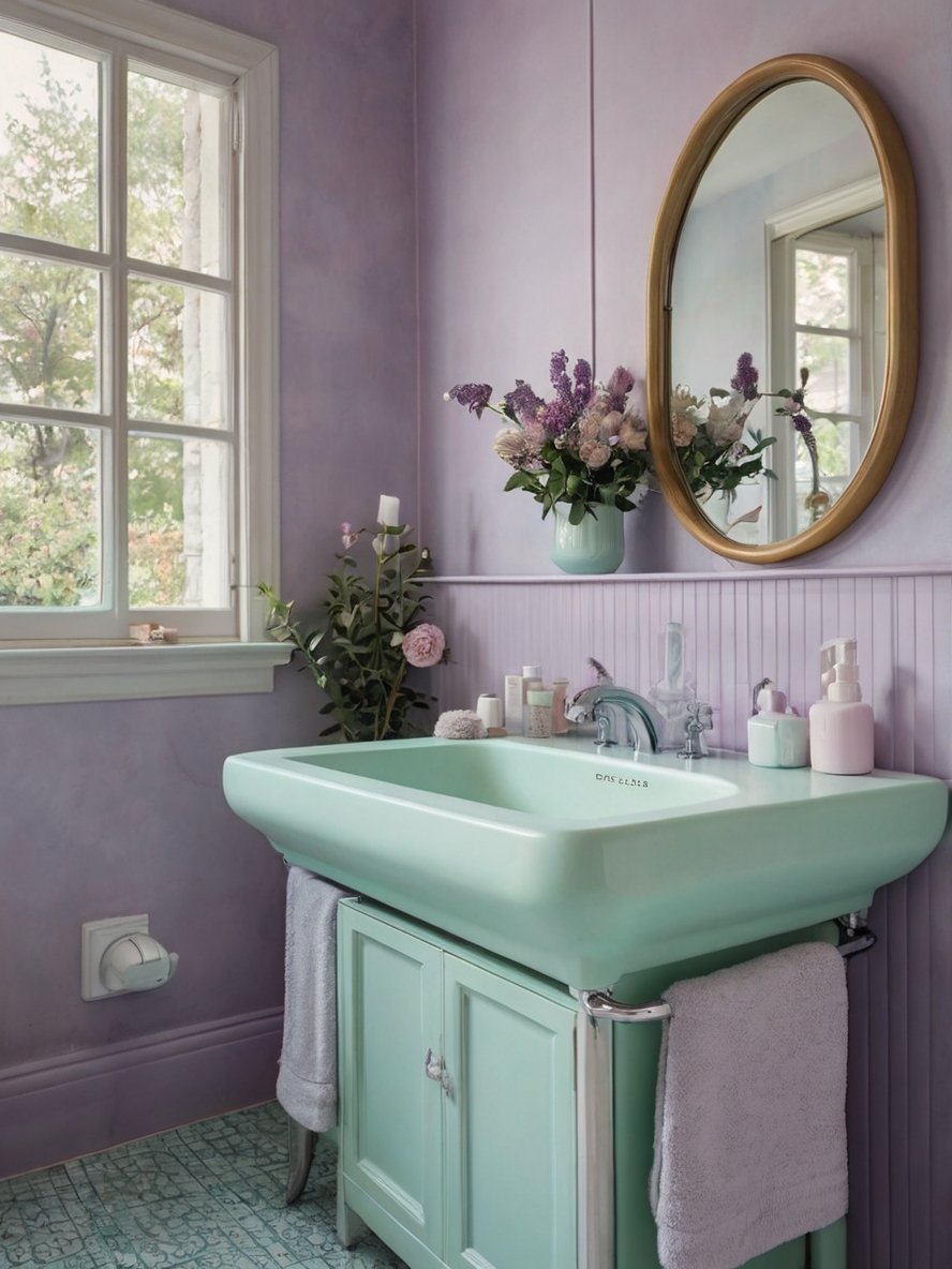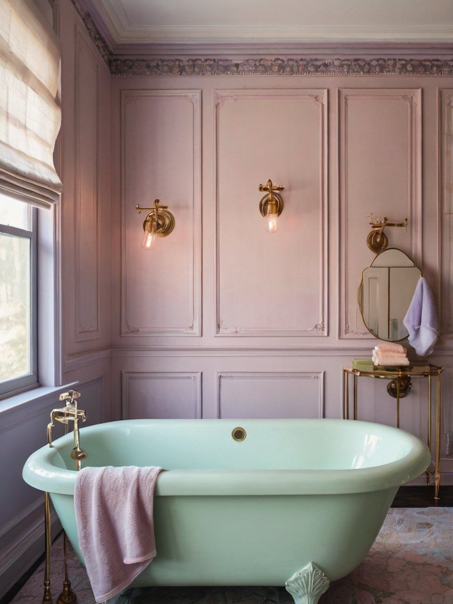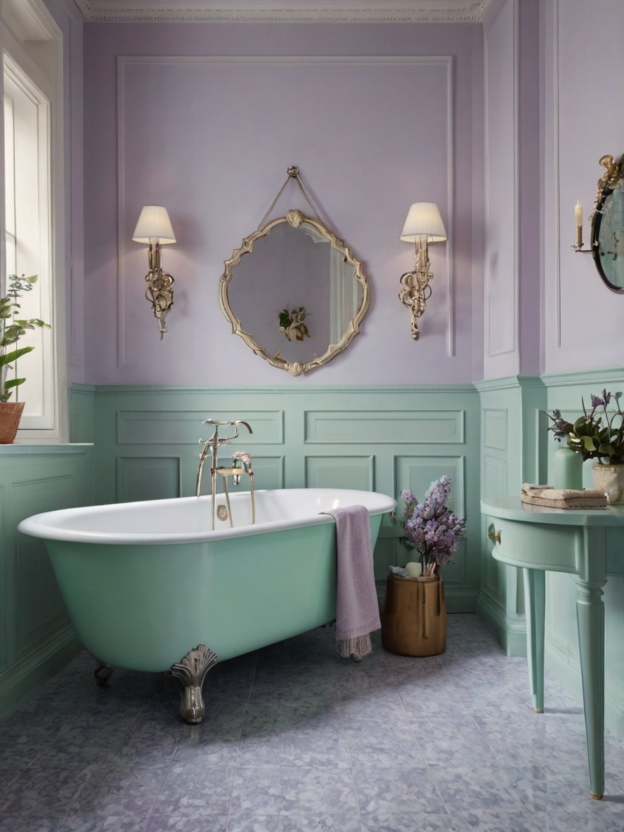 The combination of pastel lavender and mint green creates a tranquil, ethereal ambiance reminiscent of classic European interiors. The lavender-painted upper walls exude softness and relaxation, while the mint green wainscoting adds freshness and contrast. This balance between warm and cool pastels ensures the space remains visually rich while maintaining a sense of airiness. The result is a bathroom that feels both romantic and rejuvenating, evoking the charm of an old-world retreat with a modern twist.