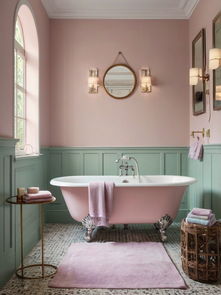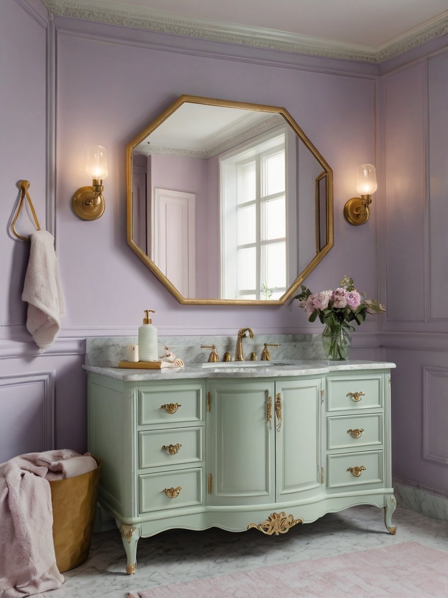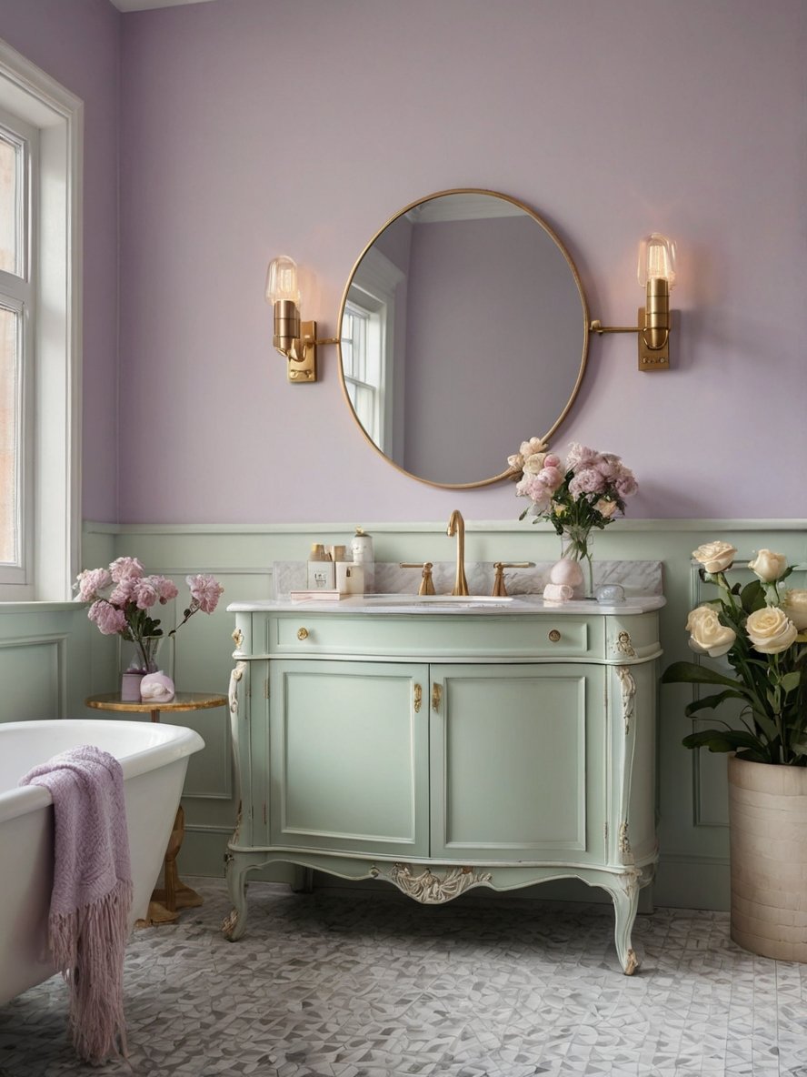 The combination of pastel lavender and mint green creates a tranquil, ethereal ambiance reminiscent of classic European interiors. The lavender-painted upper walls exude softness and relaxation, while the mint green wainscoting adds freshness and contrast. This balance between warm and cool pastels ensures the space remains visually rich while maintaining a sense of airiness. The result is a bathroom that feels both romantic and rejuvenating, evoking the charm of an old-world retreat with a modern twist.