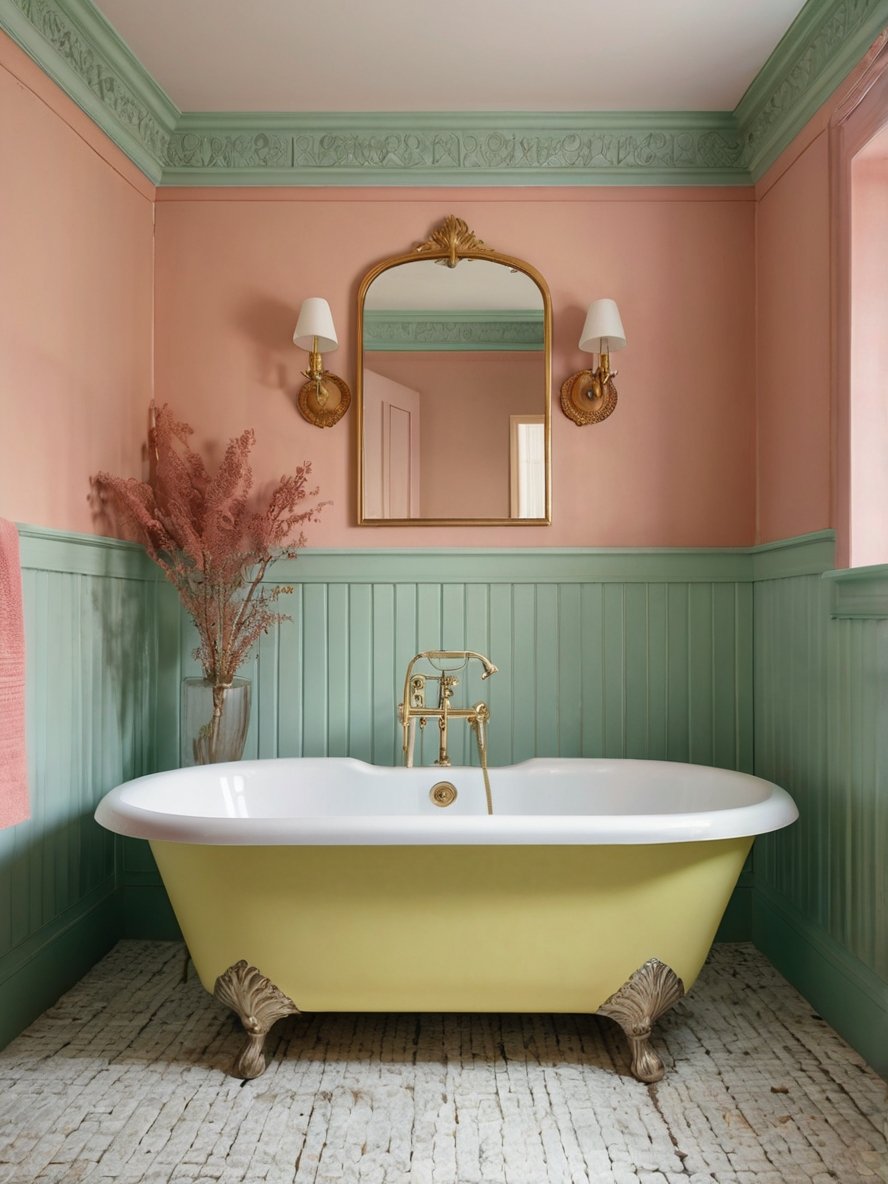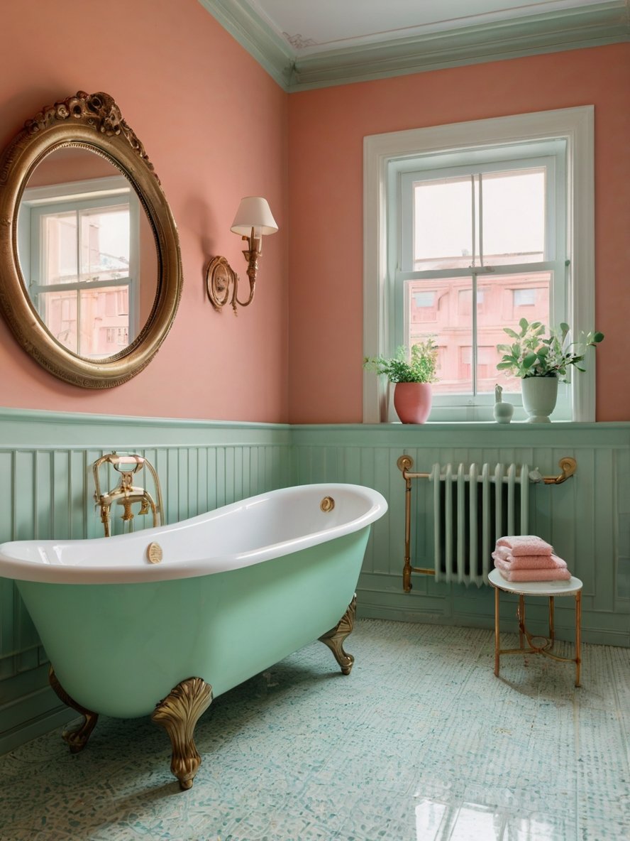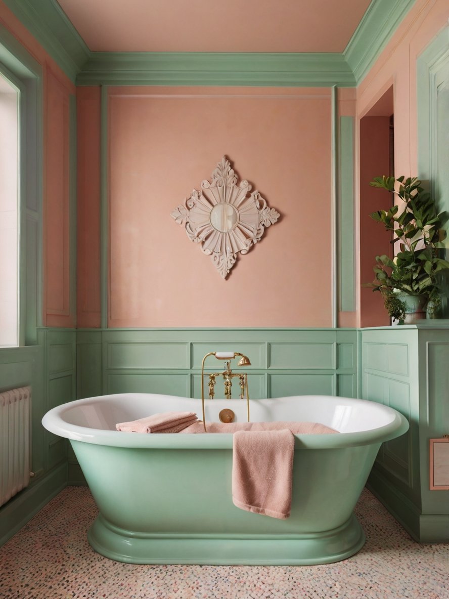 The combination of pastel green and coral in this bathroom feels both nostalgic and refreshing. The muted coral walls introduce warmth and personality, while the pastel green wainscoting and ceiling details provide a soothing contrast. This color scheme evokes a vintage European aesthetic, reminiscent of historic townhouses and grand estates. The warm coral tones prevent the space from feeling overly cool, while the green elements maintain a tranquil, spa-like ambiance. This balance of hues ensures that the space feels both vibrant and calming, perfect for a luxurious retreat.