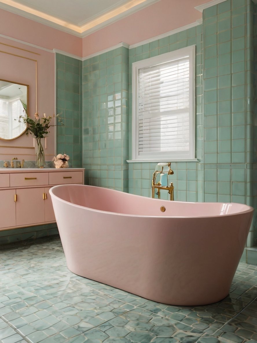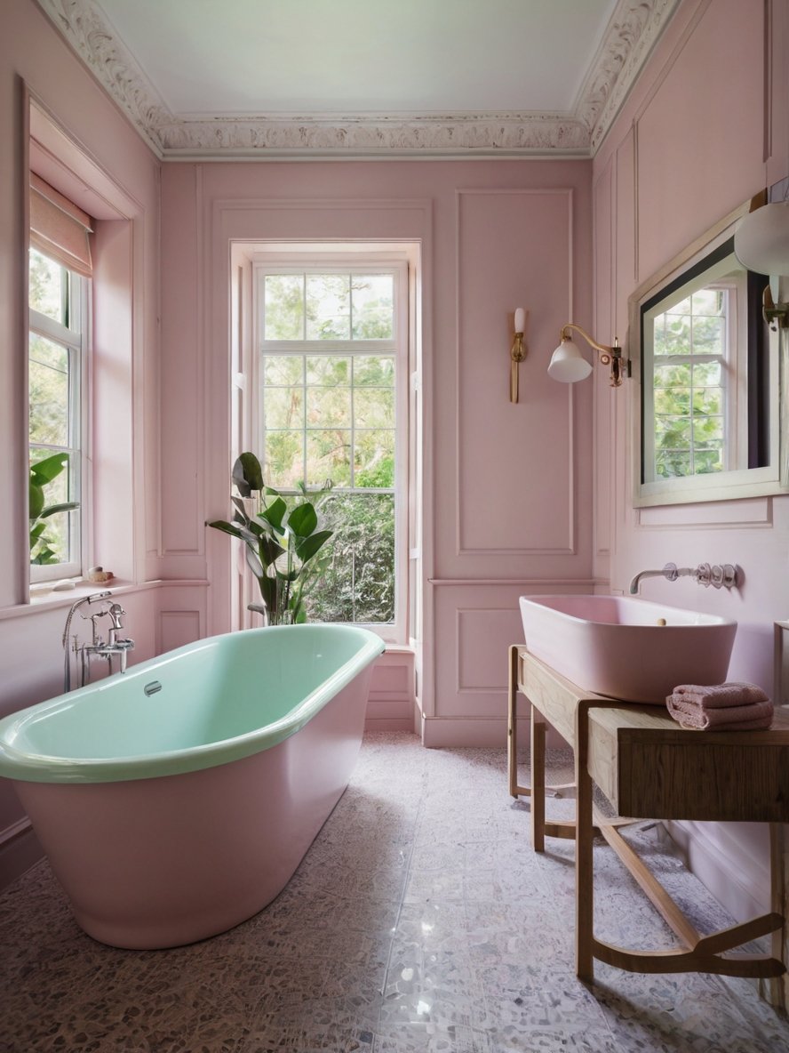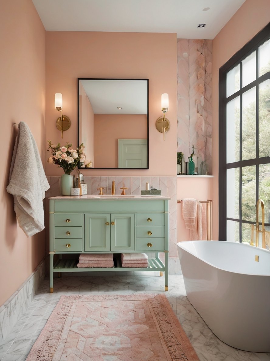 The combination of pastel green and coral in this bathroom feels both nostalgic and refreshing. The muted coral walls introduce warmth and personality, while the pastel green wainscoting and ceiling details provide a soothing contrast. This color scheme evokes a vintage European aesthetic, reminiscent of historic townhouses and grand estates. The warm coral tones prevent the space from feeling overly cool, while the green elements maintain a tranquil, spa-like ambiance. This balance of hues ensures that the space feels both vibrant and calming, perfect for a luxurious retreat.