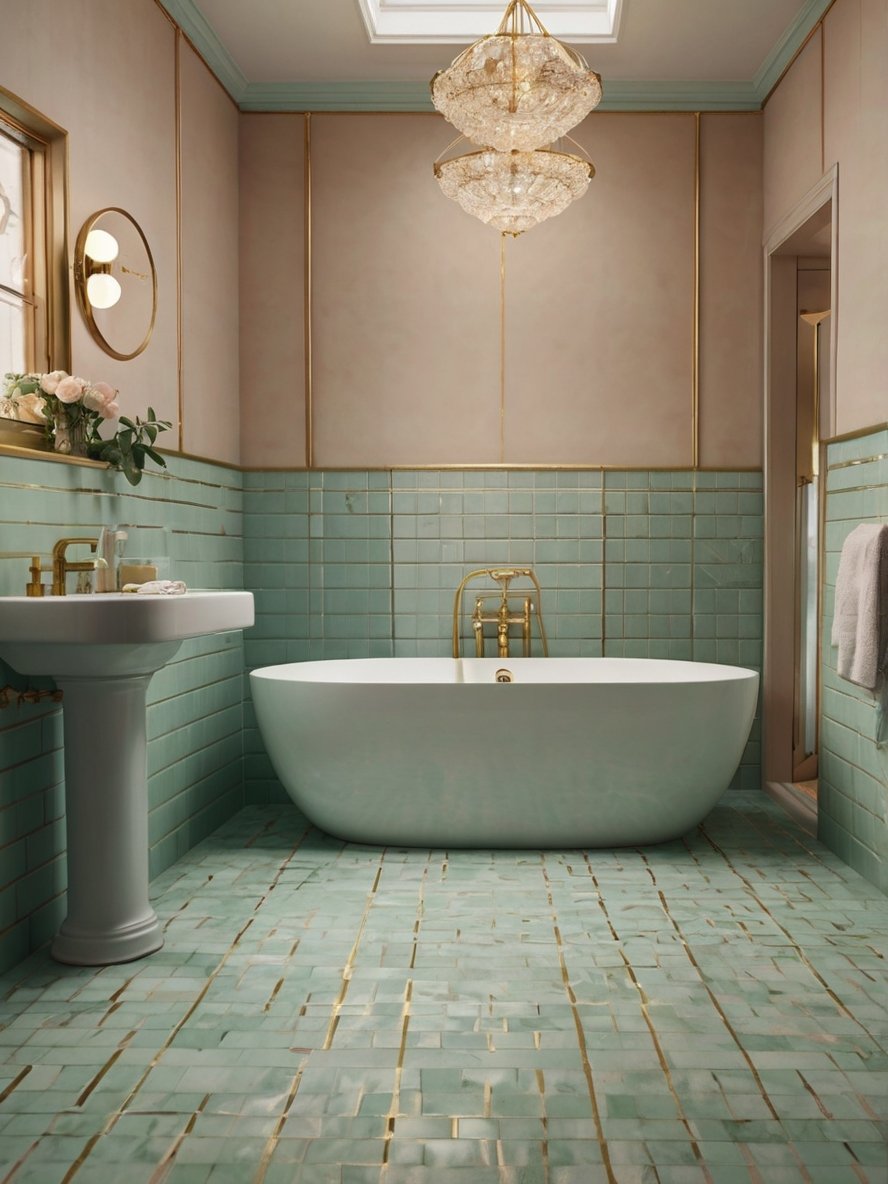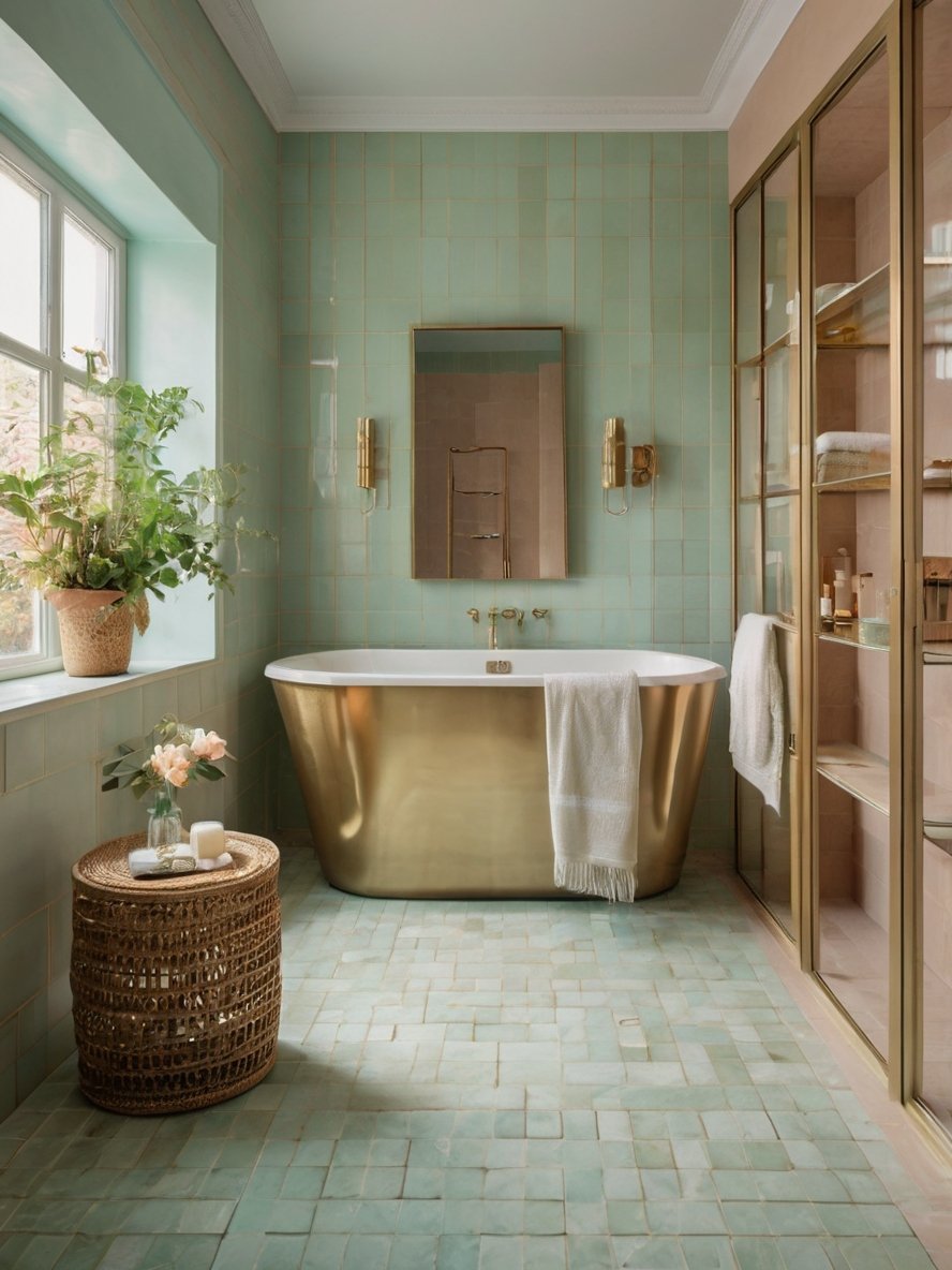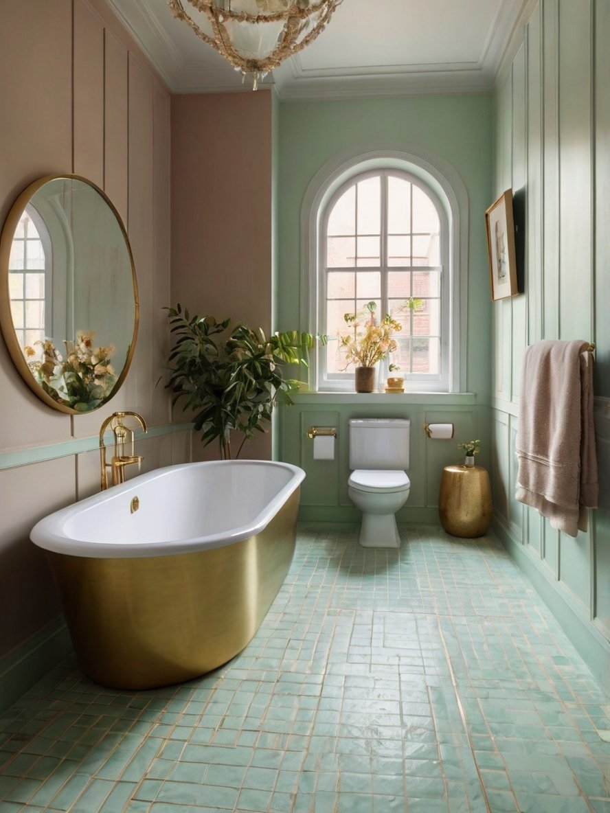 The pastel green and gold color palette in this bathroom creates a refined and luxurious ambiance that feels both refreshing and warm. The soft, muted green hues envelop the space, offering a sense of tranquility and calmness, reminiscent of spa-like serenity. Unlike bolder or darker greens, this pastel variation maintains a light and airy quality, ensuring the bathroom remains bright and open. The gold accents, on the other hand, introduce a layer of richness and opulence, elevating the space from simple to sophisticated. The combination of these two tones is particularly effective because of the way they contrast yet complement each other—green provides a soothing, nature-inspired foundation, while gold adds warmth and elegance, preventing the bathroom from feeling too cool or sterile.