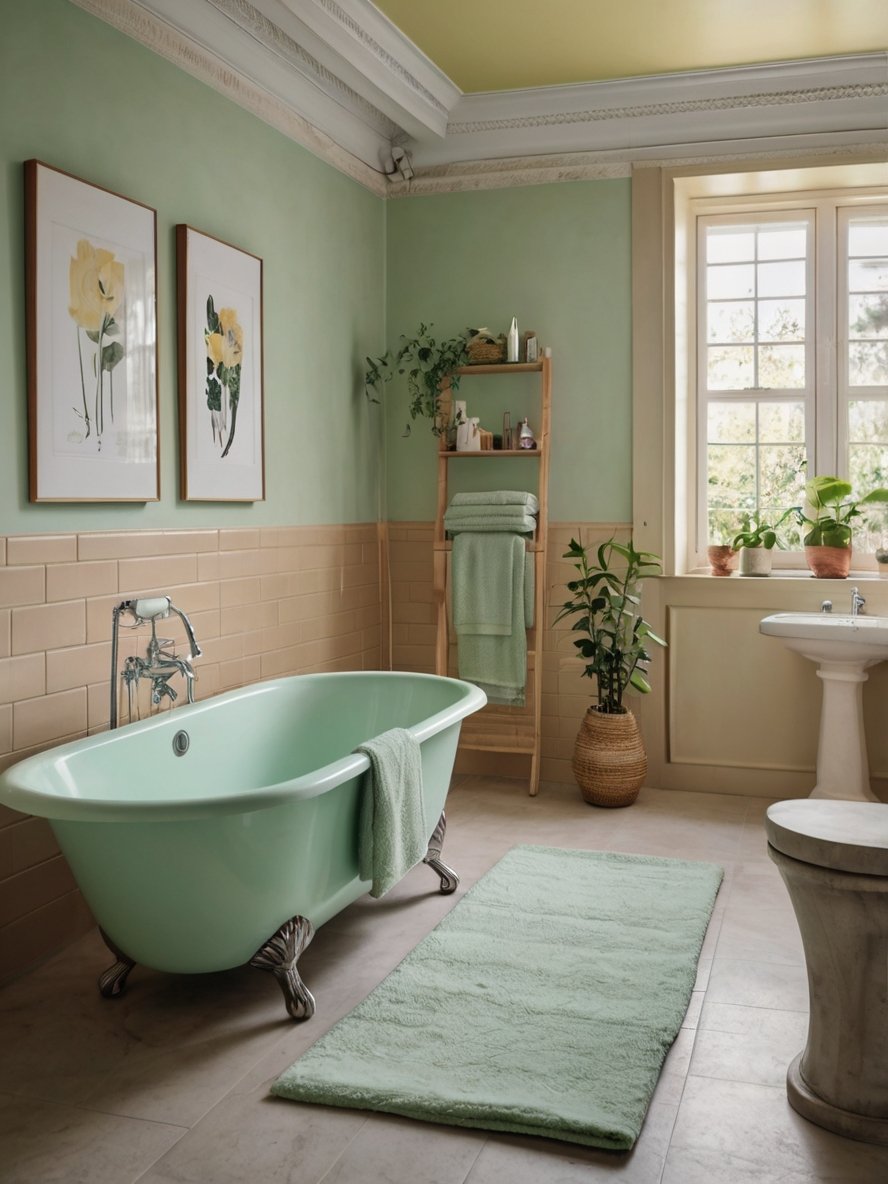 The dominant pastel green color instantly evokes a sense of tranquility and connection to nature. The walls are painted in a muted sage green, which harmonizes beautifully with the pale beige subway tiles on the lower half. This combination creates a calming yet sophisticated contrast. The green bathtub and matching accessories, such as the bath mat and towels, reinforce the cohesive color theme. The palette feels fresh yet timeless, making it a perfect choice for those who want a relaxing, spa-like retreat at home.