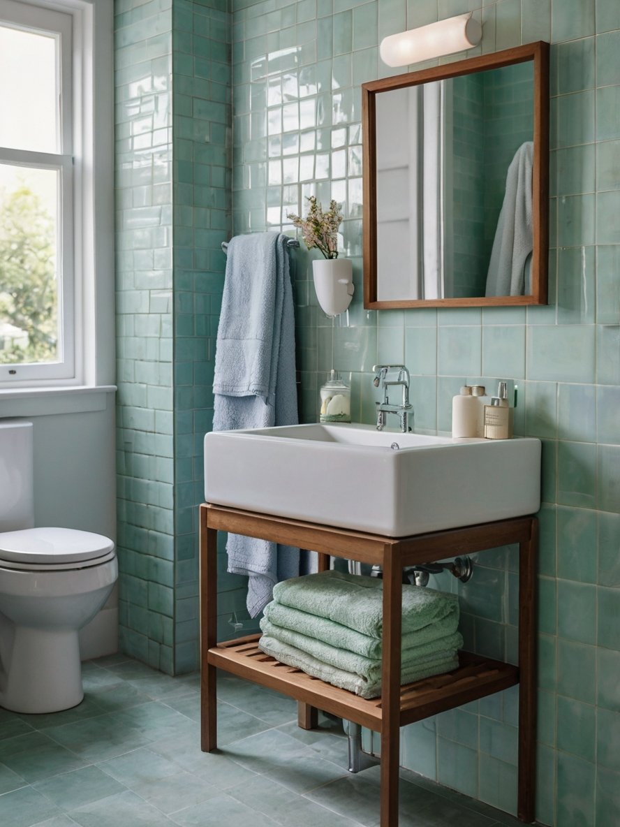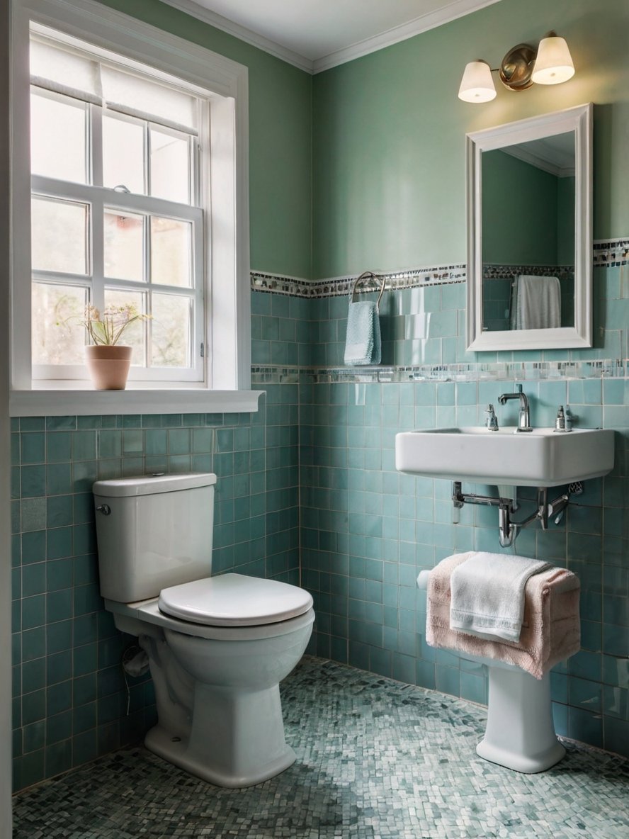 The combination of pastel green and blue creates a tranquil and spa-like atmosphere, making the bathroom feel fresh and airy. The muted green walls provide a soft backdrop, while the blue tiles add depth and structure. This harmonious blend of cool tones ensures that the space remains visually balanced, avoiding any stark contrasts. The overall effect is calming, reminiscent of natural elements like water and foliage, reinforcing a sense of relaxation.