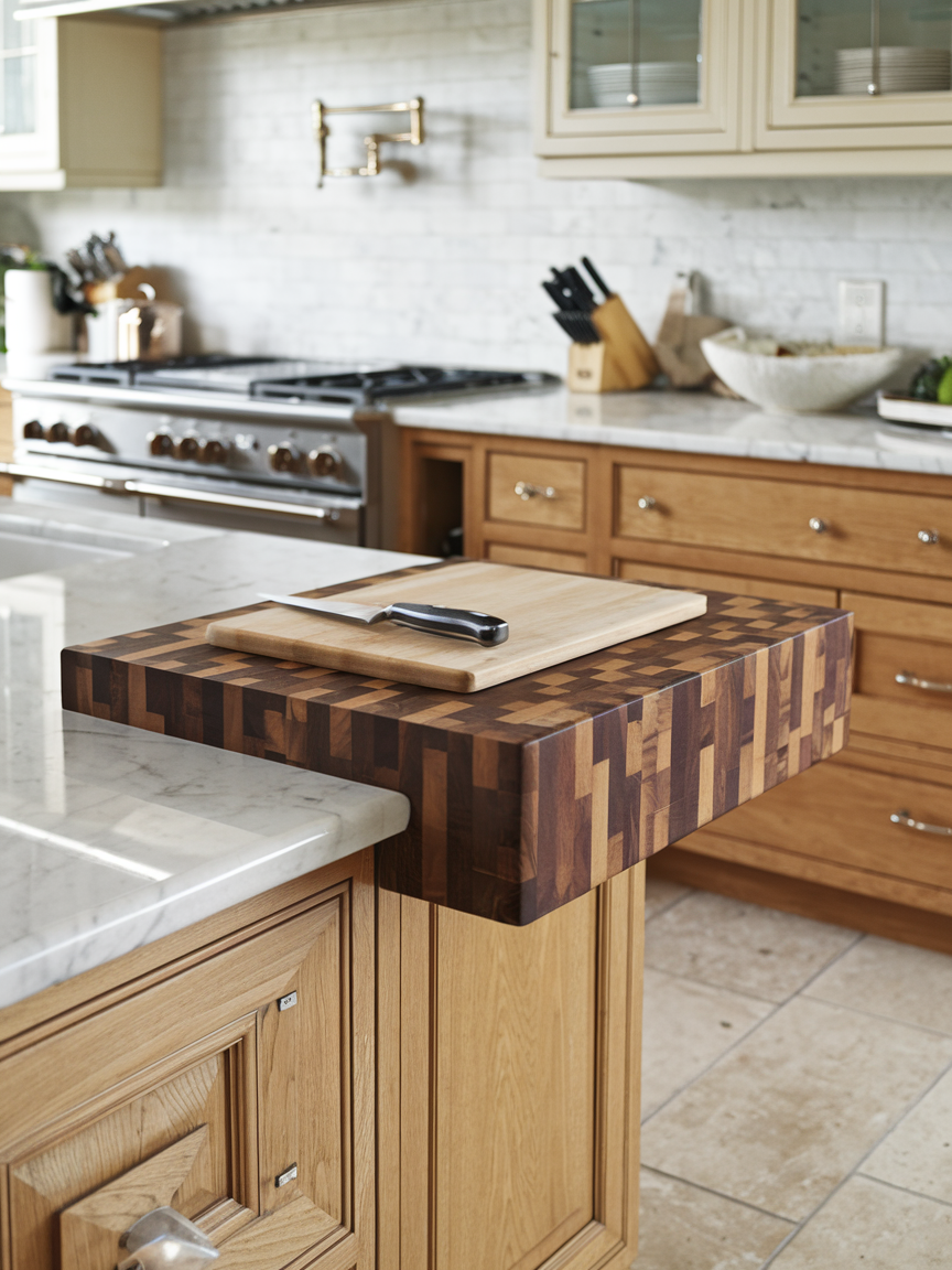 A butcher block extension is a practical addition that increases your workspace while adding warmth and contrast. It creates a dedicated area for chopping and prep work, keeping the main surface free for serving or entertaining. This feature is especially useful in busy kitchens where multiple tasks happen at once. It enhances both functionality and visual appeal, making your island feel more versatile and accommodating.