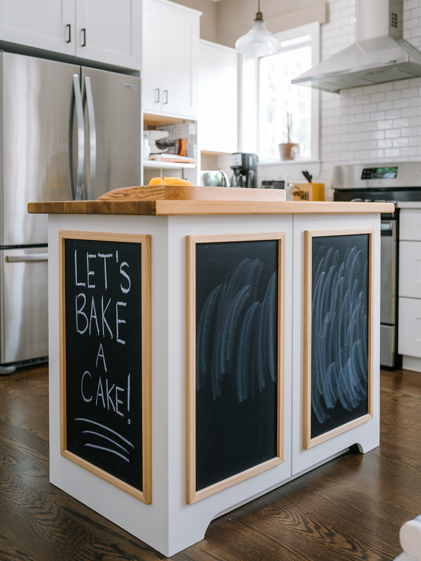 Chalkboard panels add a playful yet practical element to your kitchen island. They can be used for grocery lists, recipes, reminders, or even creative doodles. This feature makes the kitchen more interactive and family-friendly, turning the island into a communication hub. It’s a simple addition that brings personality and charm while remaining functional and easy to update.